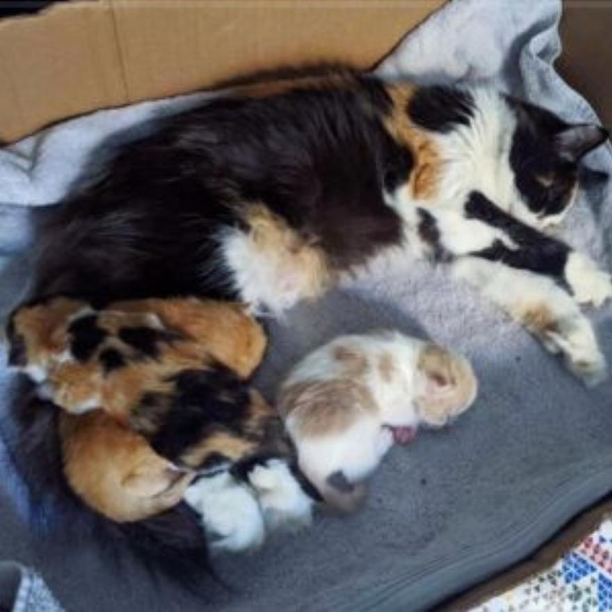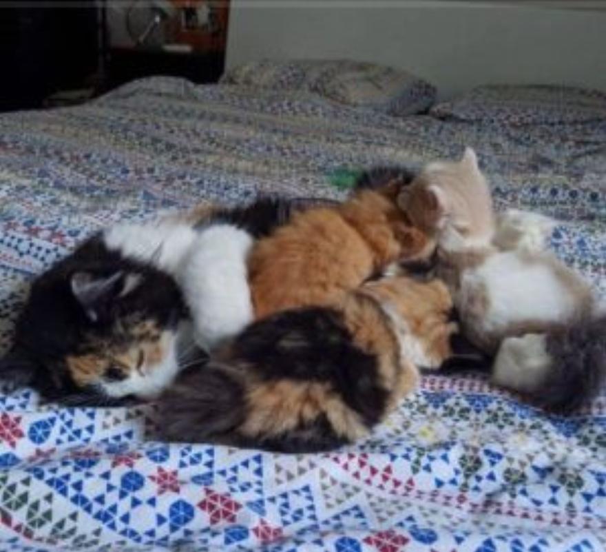 Η γάτα δεν απομακρύνθηκε ούτε ένα βήμα από τα παιδιά, και ξέχασε ακόμη και να φάει, οπότε ο Άντριαν της έδωσε φαγητό και ποτό. Η αφοσιωμένη μητέρα αποκοιμήθηκε στον κύκλο των παιδιών της αφού τελείωσε μια ολόκληρη πιατέλα με πατέ.
