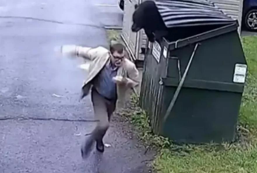 Συνέβη γύρω στις 07:00 το πρωί.Ο διευθυντής άνοιξε νωχελικά το καπάκι του κάδου και είδε μια μαύρη αρκούδα να πετάει έξω από αυτόν.
