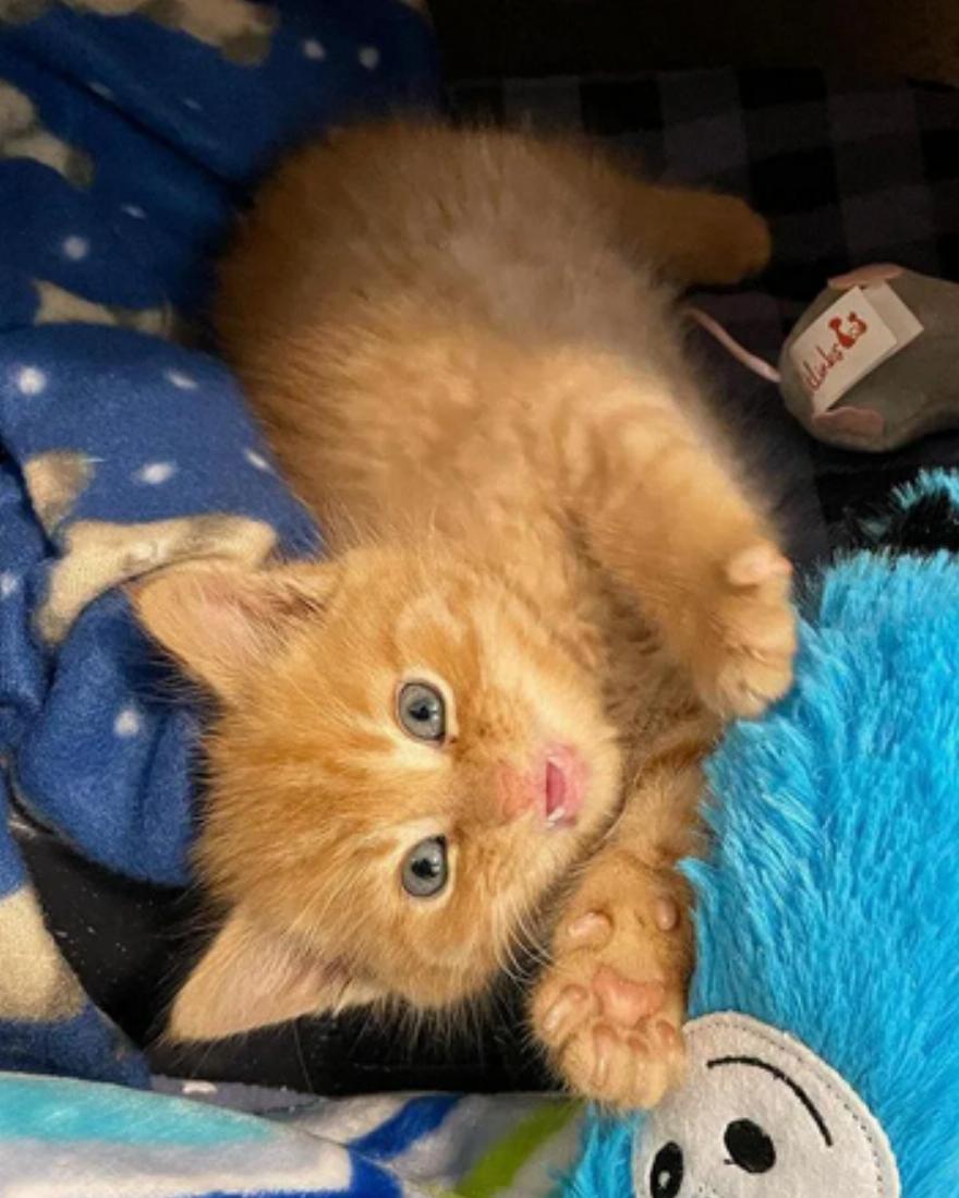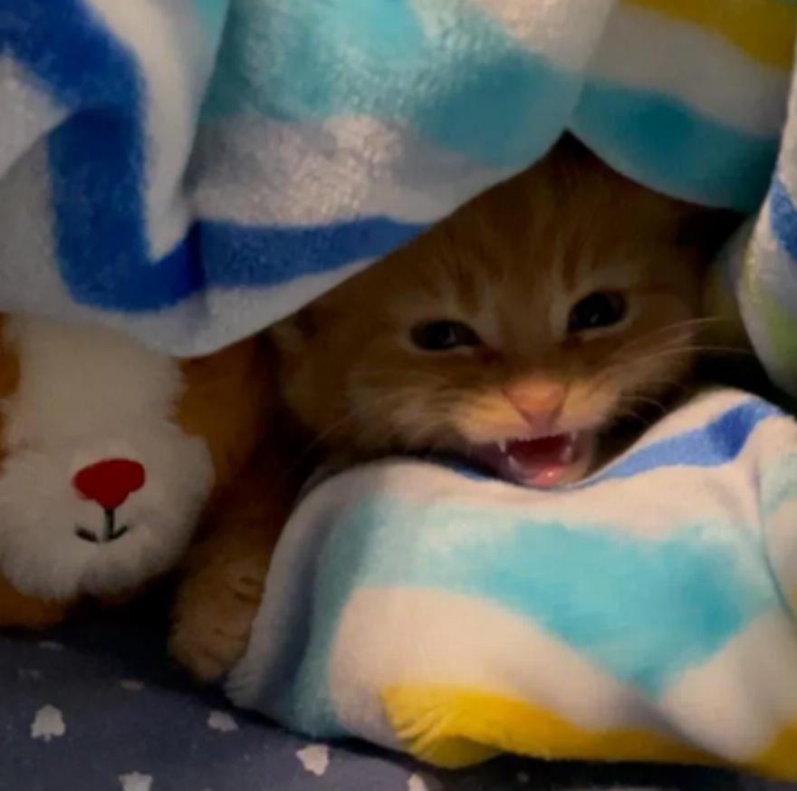 Το μικρό πορτοκαλί γατάκι χώθηκε κάτω από κουβέρτες μαζί με το παιχνίδι του. Αλλά σιγά-σιγά άρχισε να αποκτά αυτοπεποίθηση.