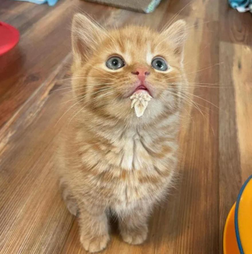Το μικρό πορτοκαλί γατάκι ήταν λίγο ντροπαλό και νευρικό κατά την άφιξή του