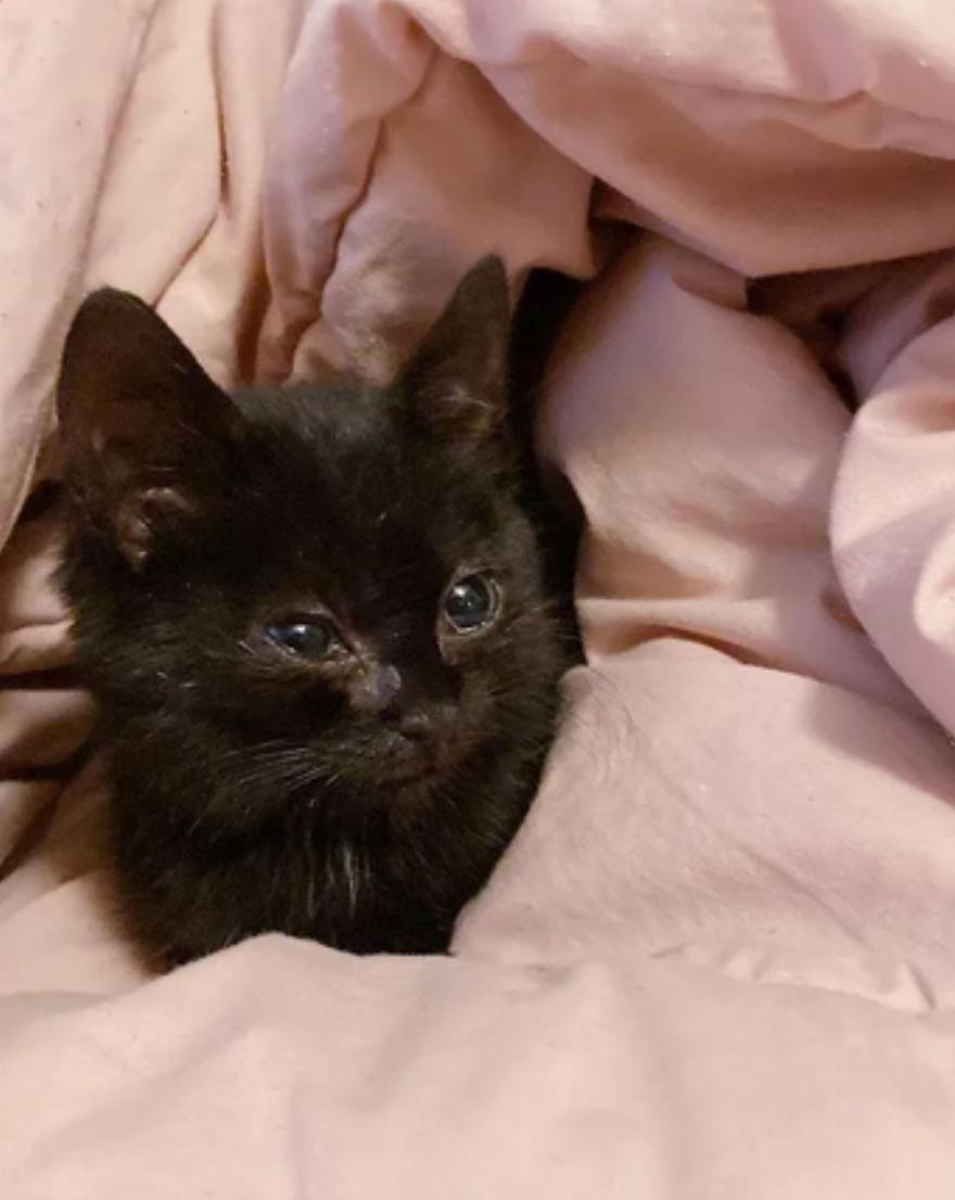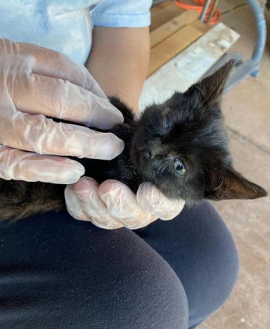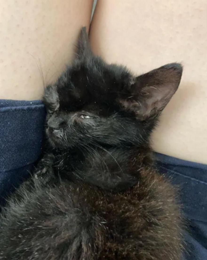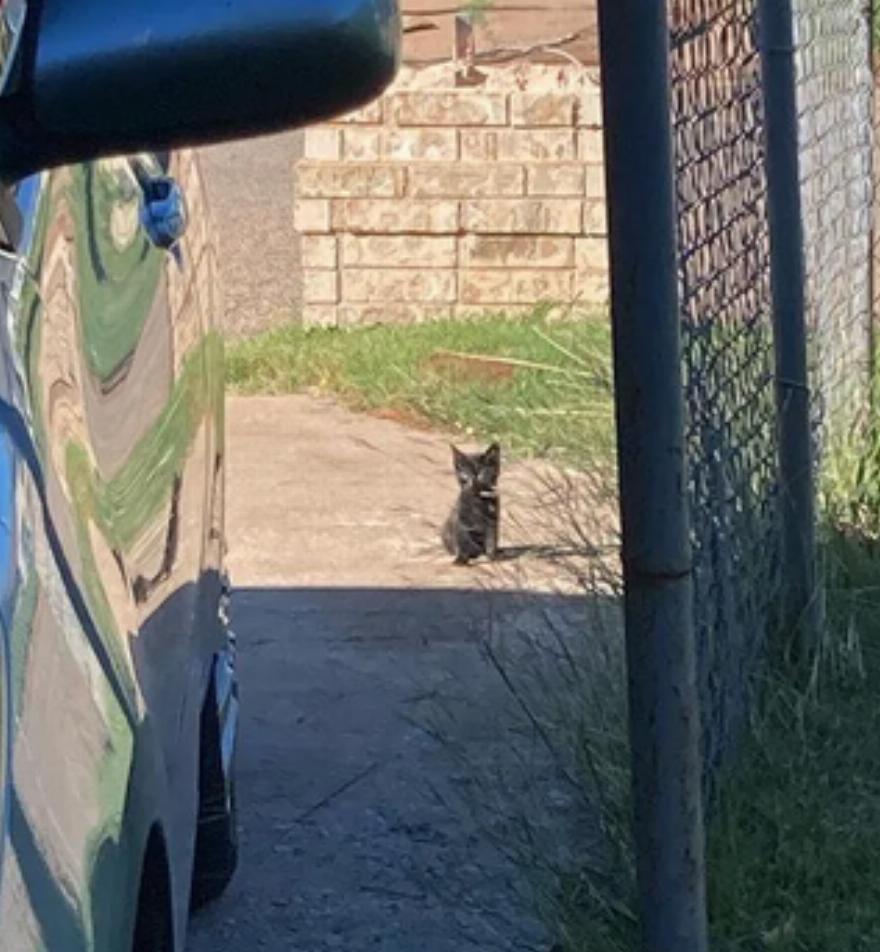 Ένα αδέσποτο γατάκι βρέθηκε να κάθεται στο δρομάκι ενός σπιτιού, εντελώς εξαντλημένο, σαν να είχε διανύσει μεγάλη απόσταση για να ζητήσει βοήθεια. Ήταν πολύ αδύνατο.