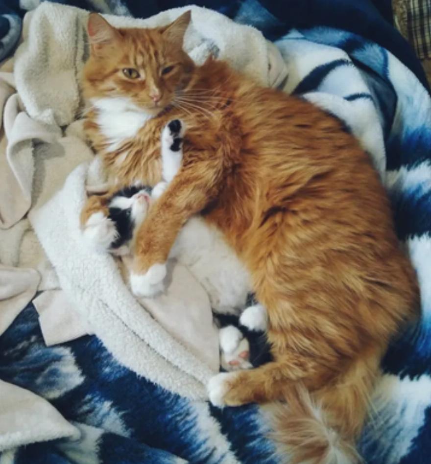 Η τζίντζερ γάτα ανέχεται την αχαλίνωτη ενέργειά της και τη λούζει με αγάπη. Μοιράζονται έναν απίστευτα στενό δεσμό.