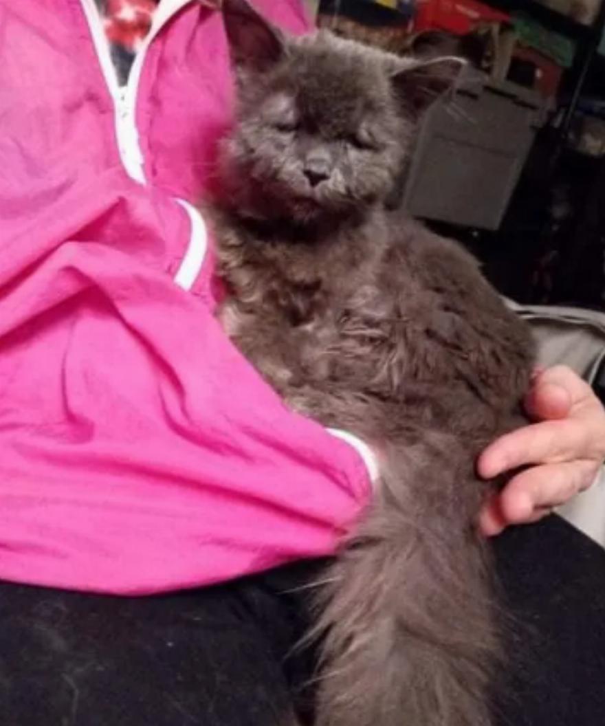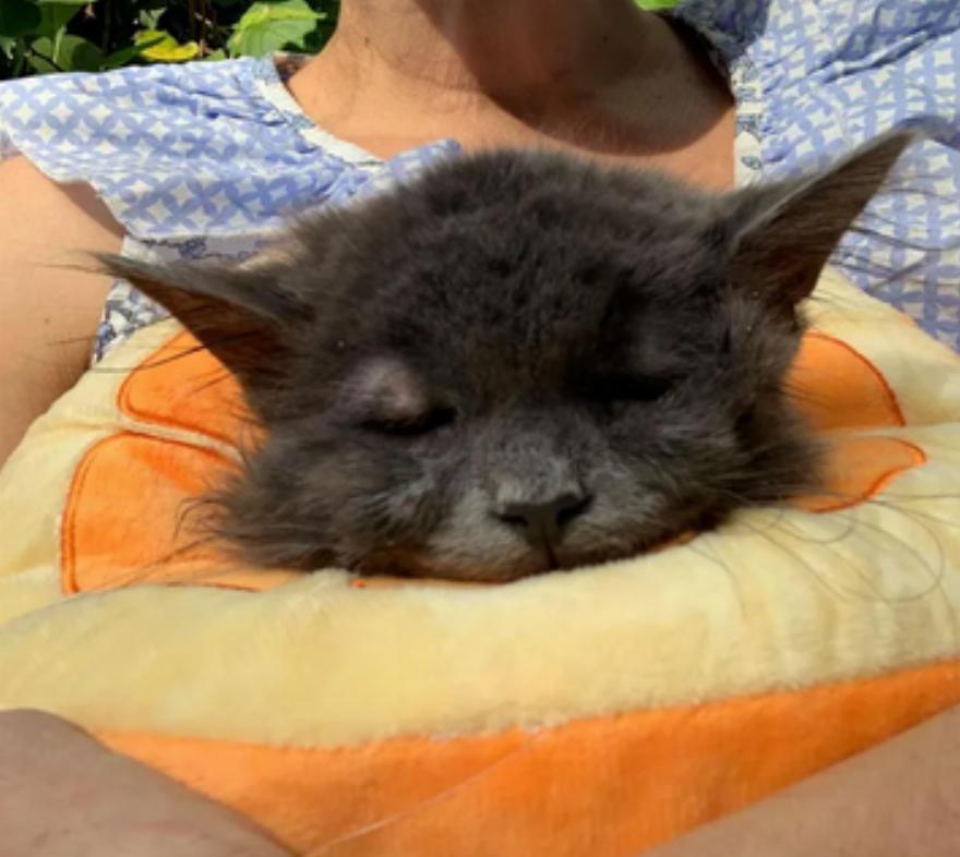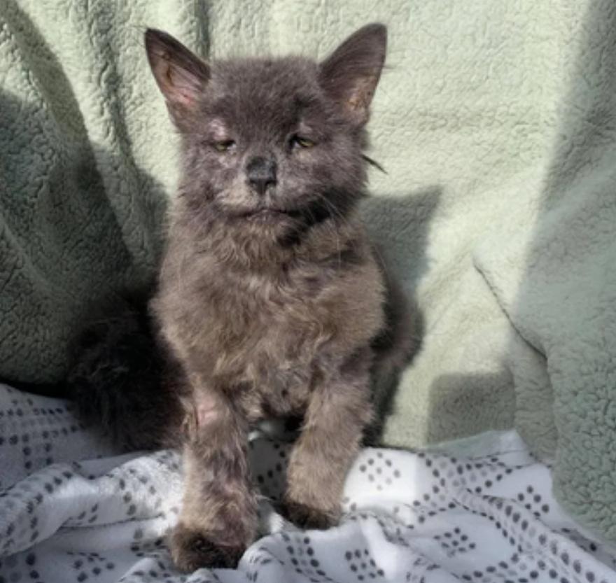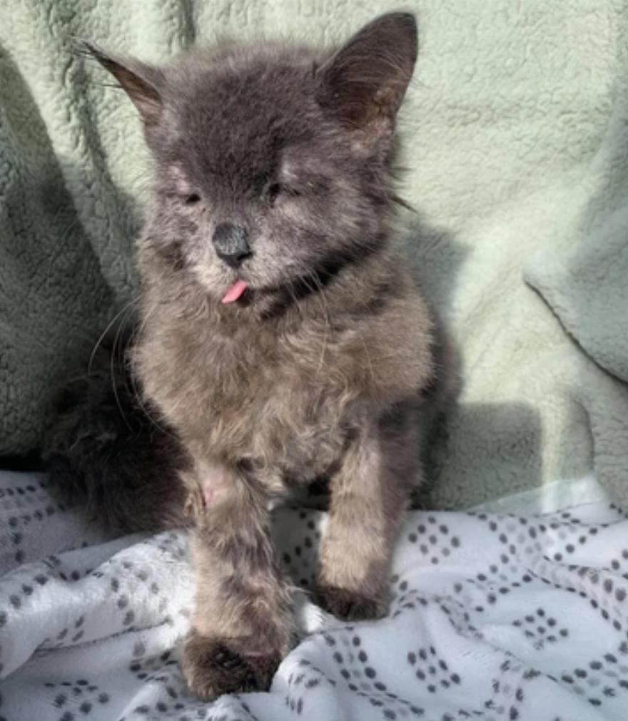 Η Tara Kay, η ιδρύτρια του Odd Cat Sanctuary, ήρθε σε επαφή με έναν διασώστη ζώων που είχε νεογέννητα γατάκια και το μικρό γκρι γατάκι ξεχώριζε. Το δέρμα του ήταν ασυνήθιστα τεντωμένο και πεσμένο, παρόλο που ήταν μόλις λίγων εβδομάδων.