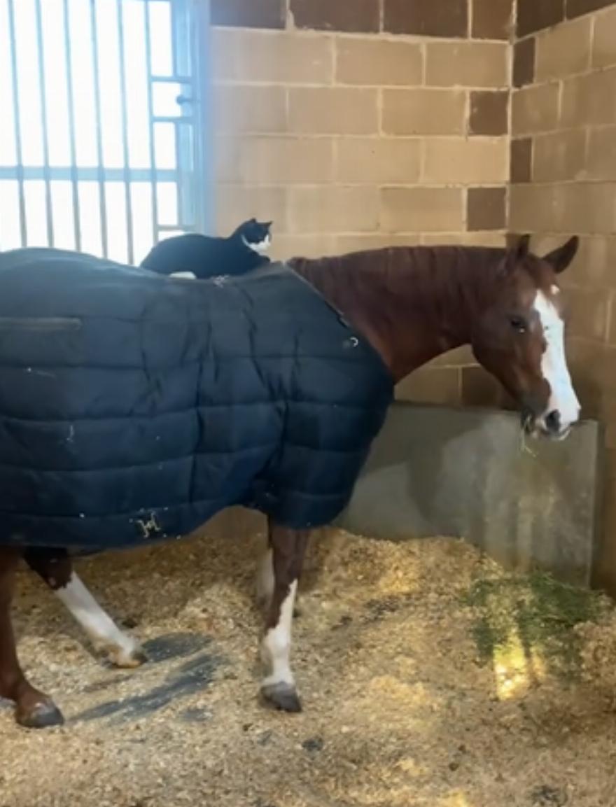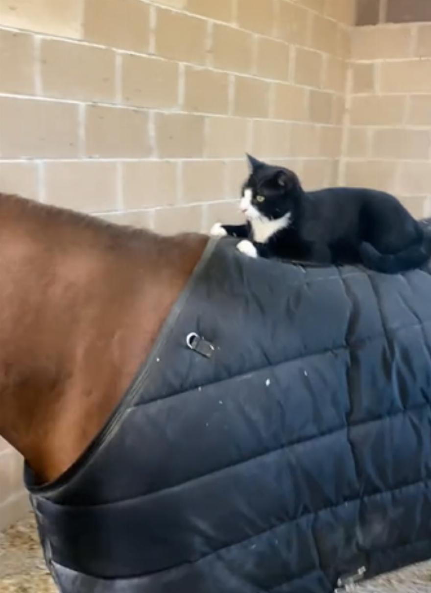 Σε ένα βίντεο που αναρτήθηκε στον λογαριασμό @theranchkitty με πάνω από 1,8 εκατομμύρια προβολές, μια ασπρόμαυρη γάτα φαίνεται να κάθεται άνετα πάνω σε ένα μεγάλο καστανόχρωμο άλογο, καθώς αυτό περιφέρεται στον στάβλο του.