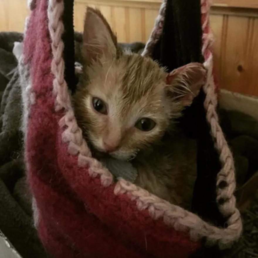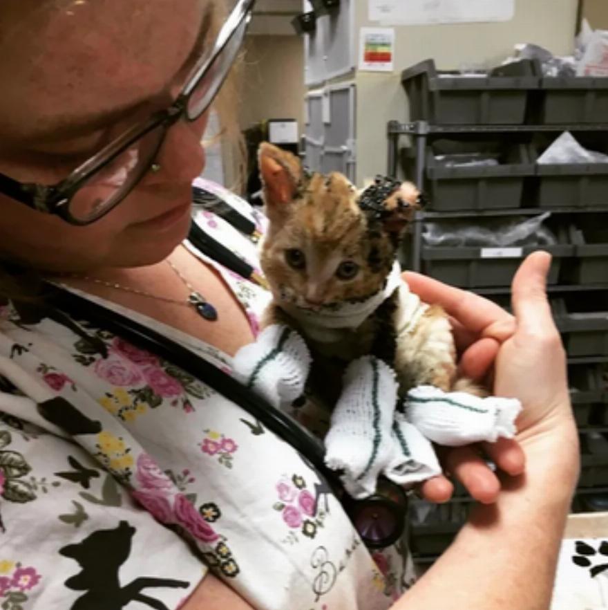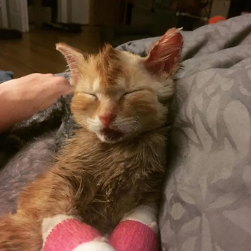 Ένα αδέσποτο πορτοκαλί γατάκι βρέθηκε από πυροσβέστες μετά από πυρκαγιά σε γκαράζ στο Sudbury του Οντάριο του Καναδά πέρυσι. Το γατάκι ηλικίας 5 εβδομάδων μεταφέρθηκε εσπευσμένα στο κτηνιατρείο Walden, όπου ανακάλυψαν εγκαύματα τρίτου βαθμού στα πόδια του και σε μερικά σημεία στην πλάτη και το κεφάλι του.