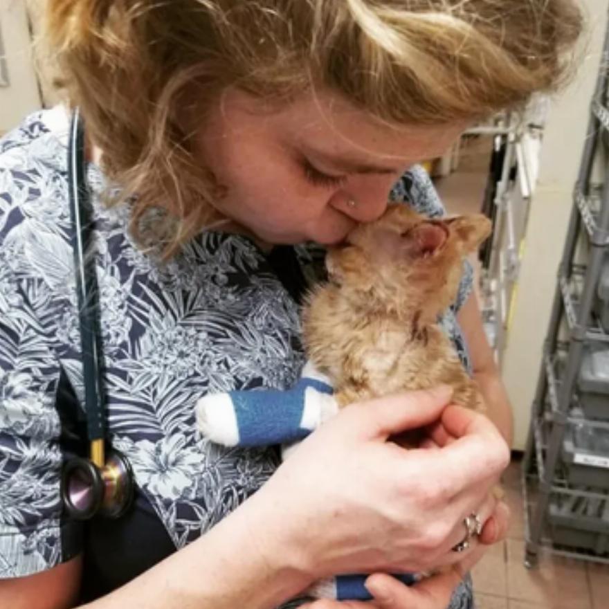Το γατάκι, το οποίο ονόμασαν Dobby, δεν είχε πρόβλημα με τους επιδέσμους που έμοιαζαν με κάλτσες στα πόδια του, και ήταν πραγματικός μαχητής κάθε φορά που λάμβανε ιατρική φροντίδα. Το προσωπικό τον αγκάλιαζε εναλλάξ και φρόντιζε να νιώθω πάντα αγαπητός.