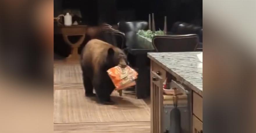 Μια αρκούδα κουβαλάει σακούλες με τορτίγιες στο στόμα της καθώς περπατάει μέσα από ένα σαλόνι και μπαίνει σε μια κουζίνα.