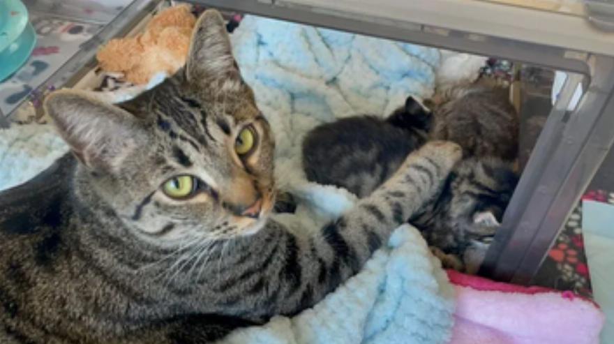 Η μητέρα γάτα τους, είναι σε ανάρρωση και η γυναίκα που τη βρήκε, τη φροντίζει.