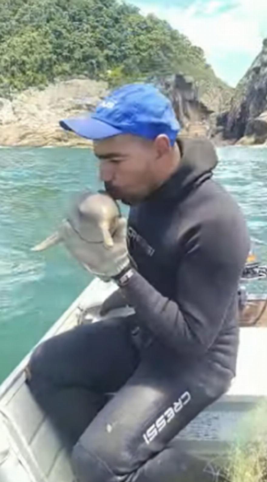 Μόλις το δελφίνι ξεμπλέχτηκε, ο άνδρας πήρε ένα δευτερόλεπτο για να το θαυμάσει και να του δώσει μερικά γλυκά φιλιά πριν το αφήσει πίσω στη θάλασσα. Όλοι στη βάρκα ζητωκραύγασαν καθώς το μικροσκοπικό μωρό κολύμπησε ελεύθερα στα βάθη, έτοιμο να βρει το δρόμο για το σπίτι του!