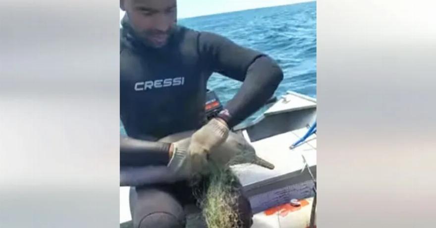 Ενας άνδρας εντόπισε ένα πλάσμα να παλεύει στο νερό, οπότε κατευθύνθηκαν προς τα εκεί για να το δουν από κοντά. Γρήγορα ανακάλυψαν ένα μωρό δελφίνι παγιδευμένο σε ένα χάος από μπερδεμένα δίχτυα αλιείας.