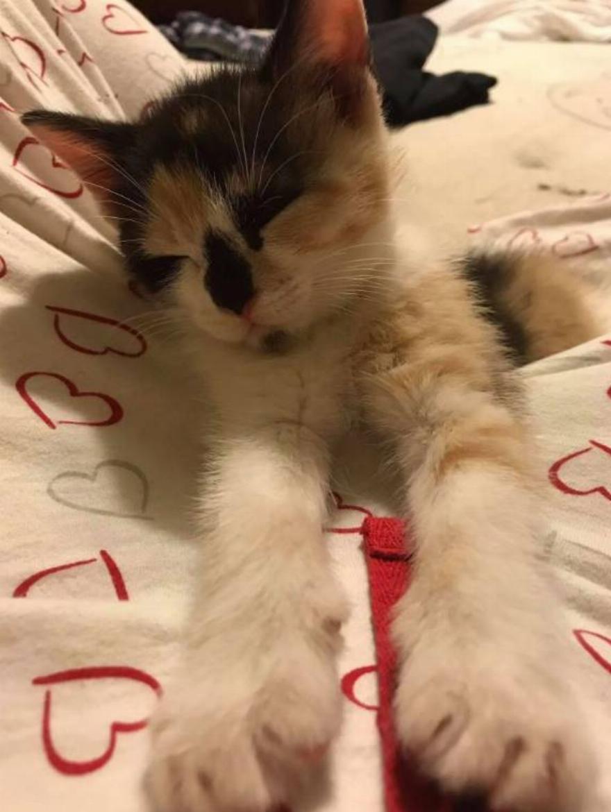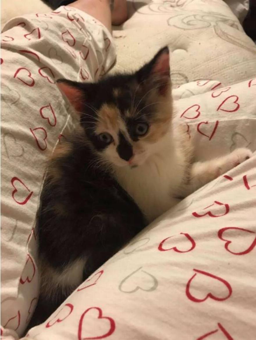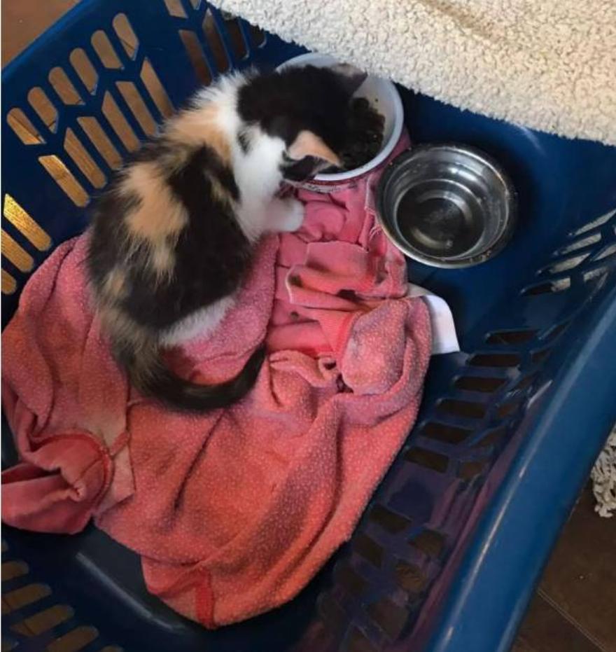 Ένα μικρό calico γατάκι κλαψούριζε μέσα στο κλουβί. Ο Moore δήλωσε: “Όταν με εντόπισε, πήγε κατευθείαν στο μπροστινό μέρος του κλουβιού και ήρθε σε οπτική επαφή μαζί μου”.