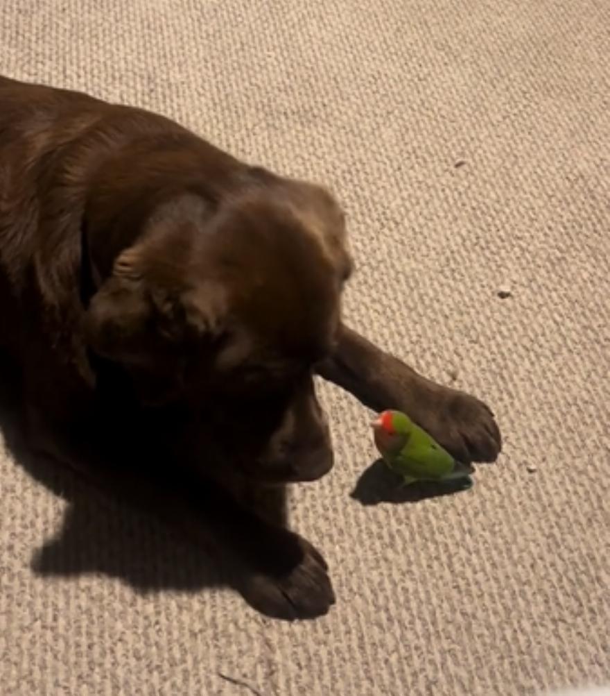 Το βίντεο που μοιράστηκε ο @spishley αναφέρει: “Το πουλί που πήραμε από το Craigslist φαίνεται να είναι φίλοι με το Lab μου”.