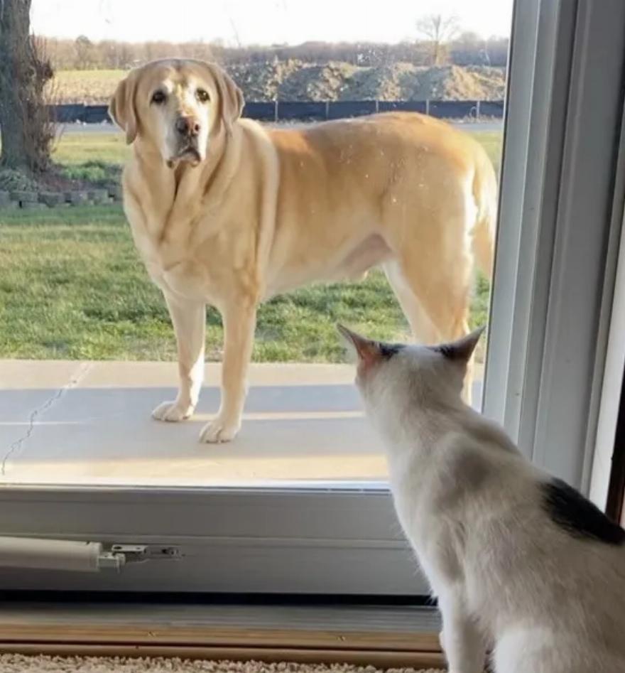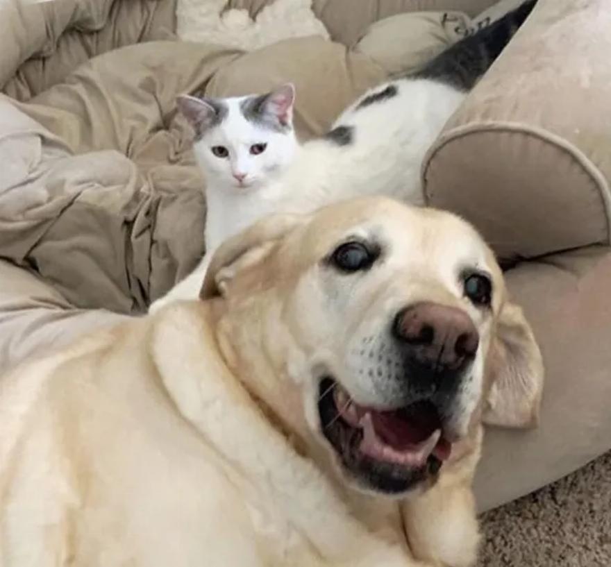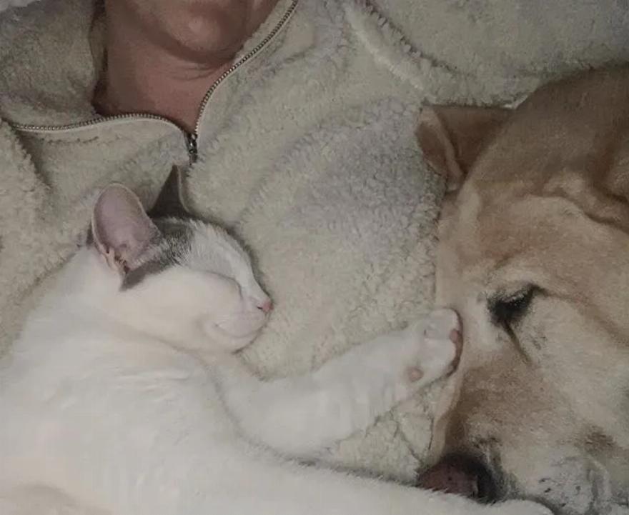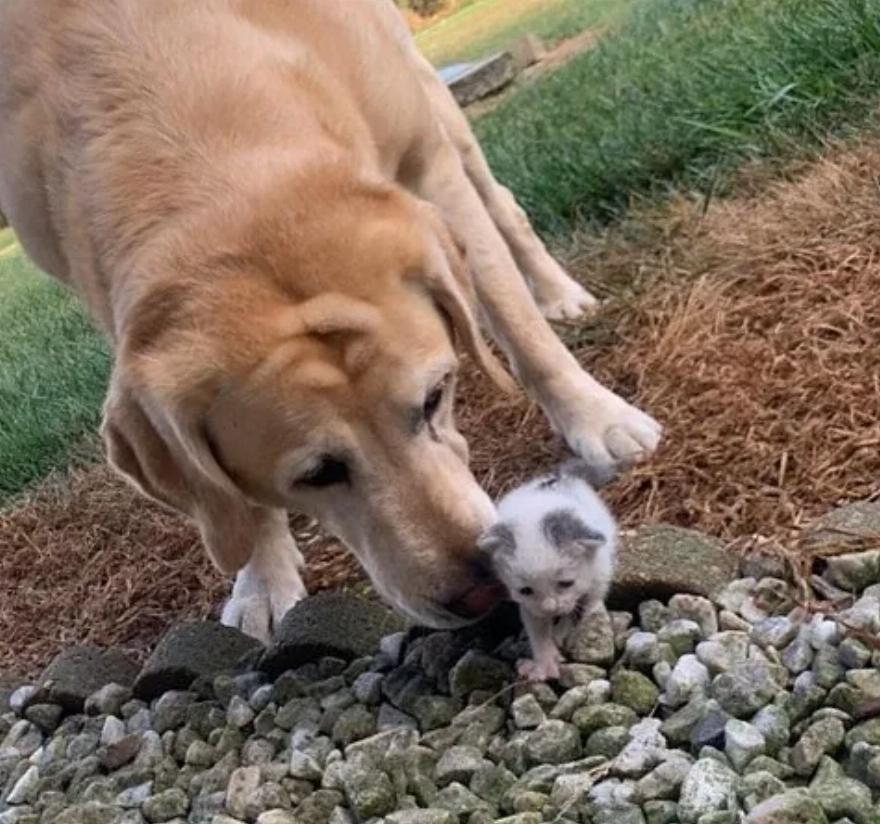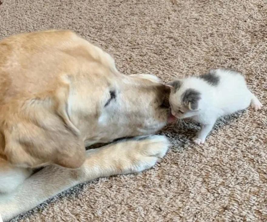 Το γλυκό λαμπραντόρ συνάντησε το γατάκι αφού της έκαναν πρώτα μπάνιο. Το μικρό γατάκι κουλουριάστηκε δίπλα του και κοιμήθηκε αμέσως.