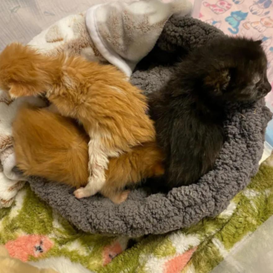 Η Laura άρχισε να ταΐζει με σύριγγα τα γατάκια και τους ξεκίνησε θεραπεία για κάποια στομαχικά προβλήματα. Τους δόθηκε μια άνετη, ζεστή φωλιά για να κοιμηθούν και όλη η προσοχή και η αγάπη.