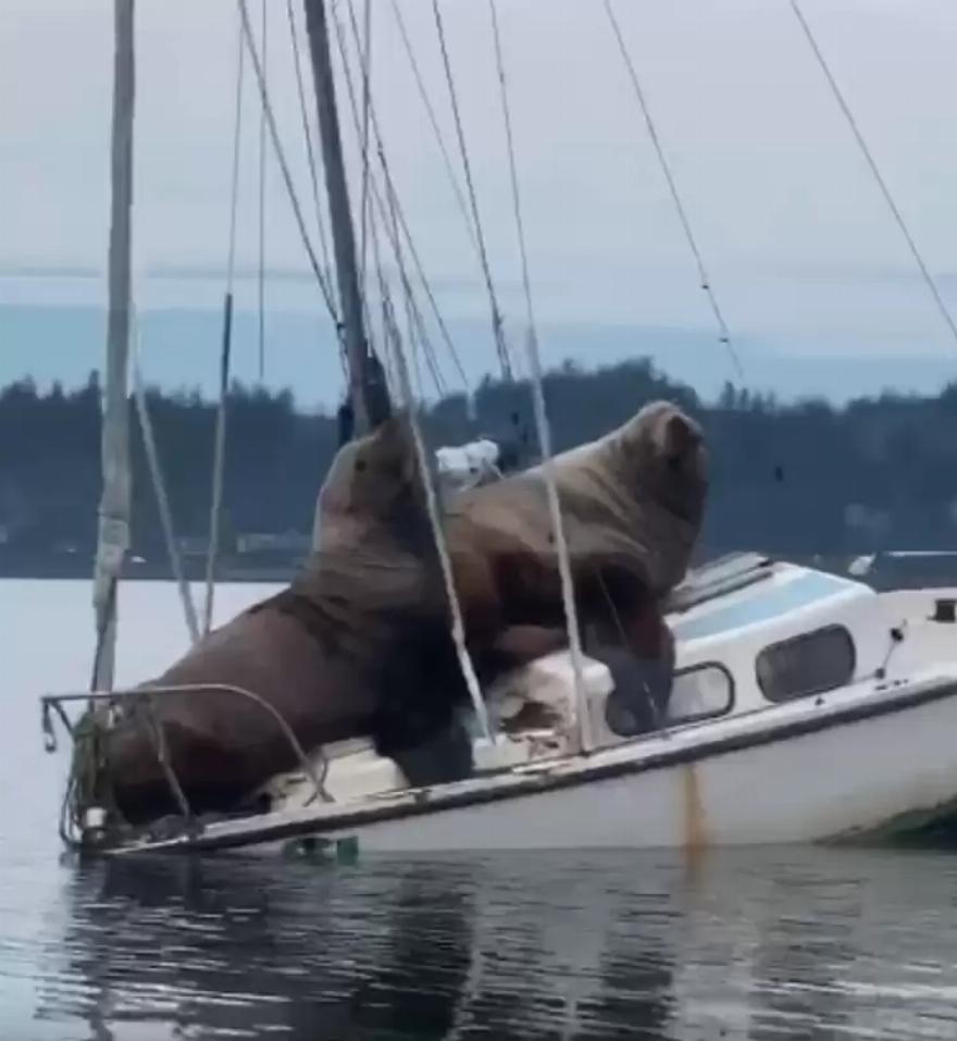 Προφανώς, ενώ είχαν βγει για κολύμπι, τα τεράστια θαλάσσια θηλαστικά αποφάσισαν να ξεκουράσουν για λίγο τα πτερύγιά τους δανειζόμενα το (συγκριτικά μικροσκοπικό) σκάφος κάποιου για να ξαπλώσουν πάνω του. Το σκάφος, όπως θα δείτε, δεν ήταν ακριβώς σχεδιασμένο για να χειρίζεται τέτοιους γιγάντιους επιβάτες.