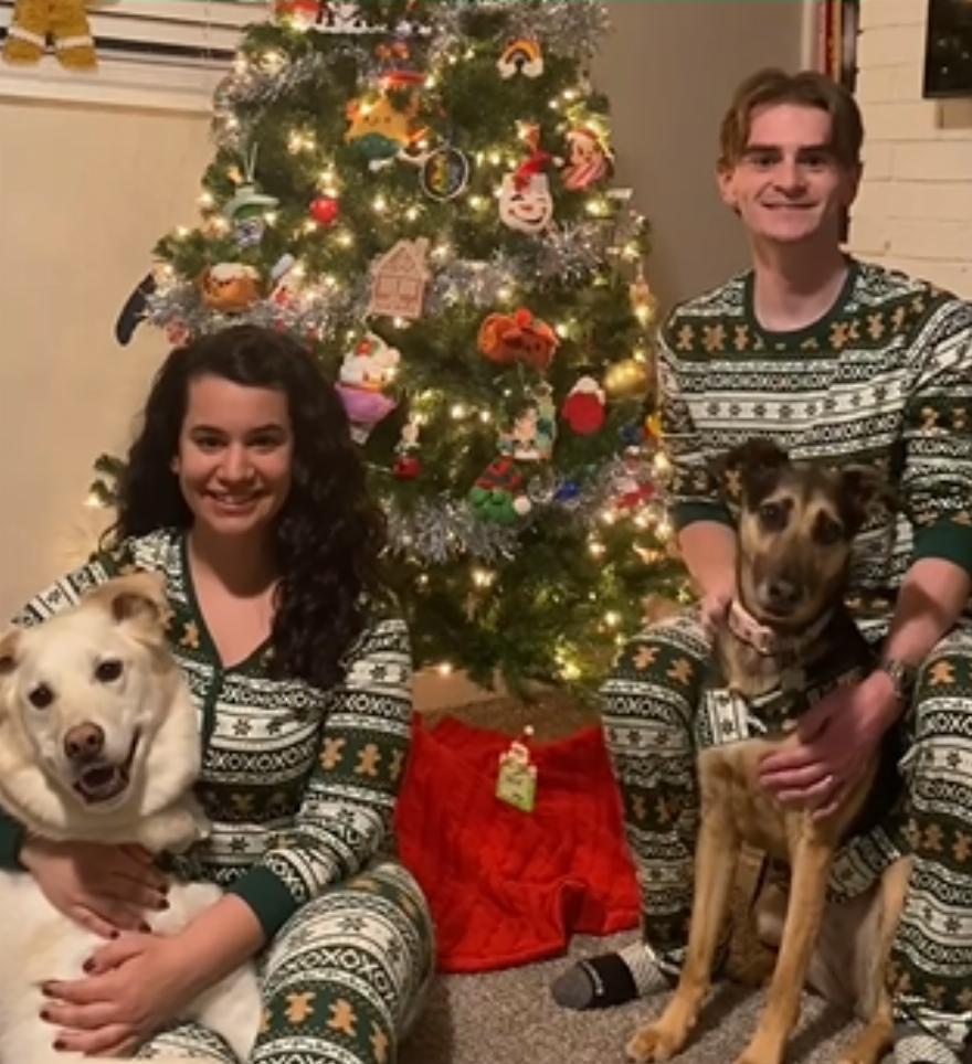 Τα πλάνα δείχνουν έναν άνδρα και μια γυναίκα να φορούν ασορτί πιτζάμες με χριστουγεννιάτικο θέμα και ο καθένας τους να κρατάει έναν σκύλο ανάμεσα στα πόδια του. Κανείς τους δεν κοιτάζει την κάμερα.