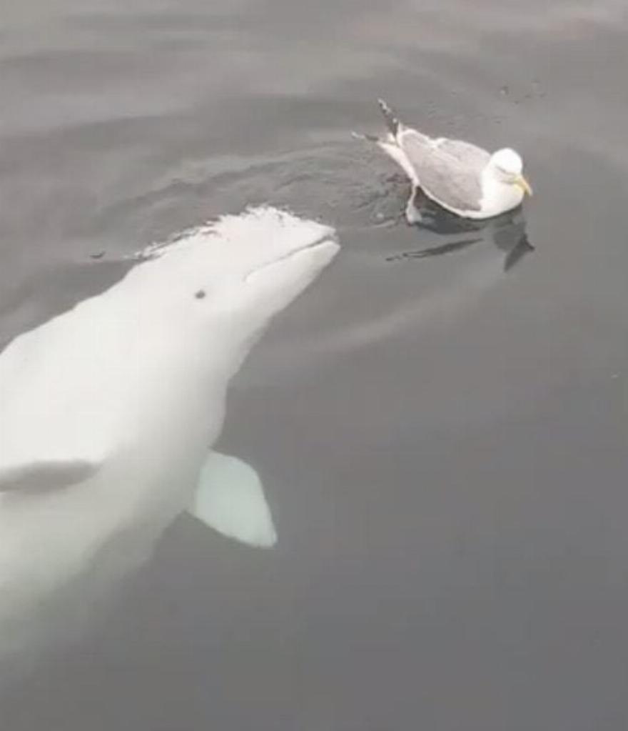 Μια φιλική φάλαινα Beluga καταγράφηκε σε βίντεο να προσπαθεί να κάνει έναν γλάρο να παίξει μαζί της. Η φάλαινα – με το παρατσούκλι Hvaldimir – εντοπίστηκε από τον Jan-Olaf Johansen έξω από τις αποβάθρες στο Hammerfest της Νορβηγίας.