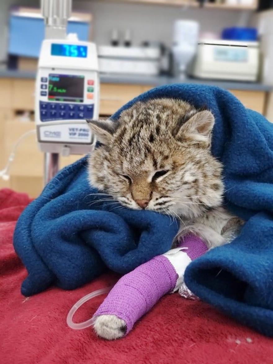 Το νοσοκομείο Douglas Animal Hospital δήλωσε ότι η αγριόγατα “ήταν τόσο αφυδατωμένη, κρυωμένη, πεινασμένη και αναιμική (χαμηλός αριθμός αίματος) κατά την εισαγωγή της, ώστε τα όργανά της άρχισαν να την εγκαταλείπουν”.