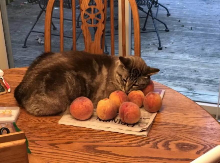 Δεν είναι ότι ο Ozzy θέλει να φάει τα ζουμερά φρούτα. Για τον 5χρονο γάτο, κανένα κρεβάτι δεν μπορεί να συγκριθεί με μια στοίβα από ώριμα ροδάκινα. Στην πραγματικότητα, καταφέρνει μάλιστα να βρίσκει πολλαπλές χρήσεις για τα χνουδωτά φρούτα κάθε φορά που η οικογένειά του τα φέρνει στο σπίτι.