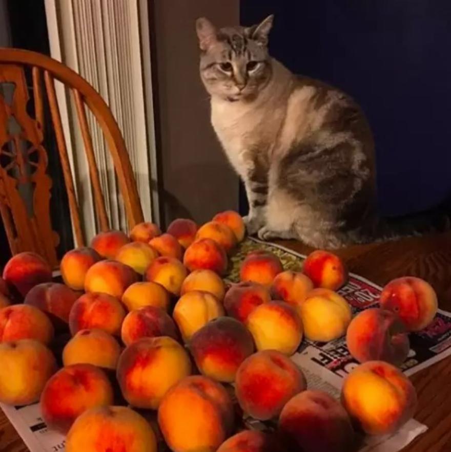 My parents’ cat inexplicably LOVES peaches, and it’s the most delightful thing. They send regular picture updates to the family group chat of this cat just chilling with the peaches. It’s the most important notification I get to my phone. pic.twitter.com/mPEQaRF8Mv