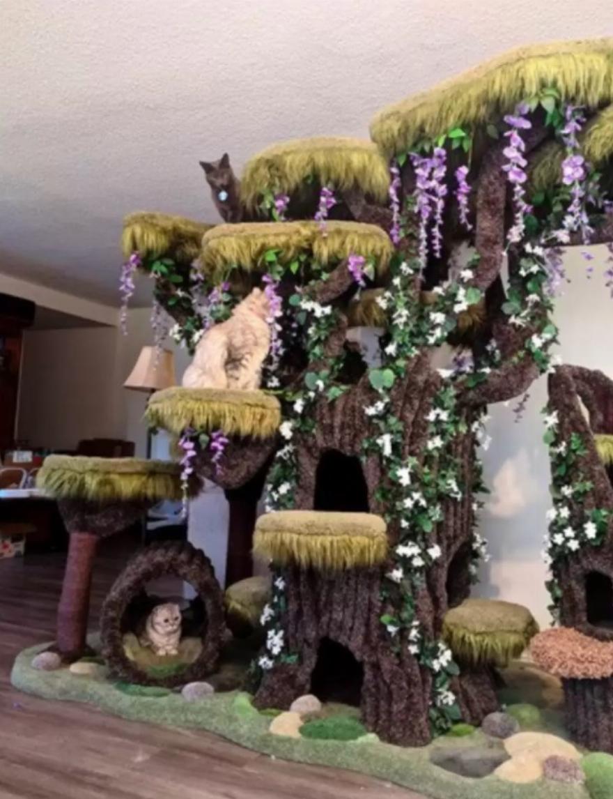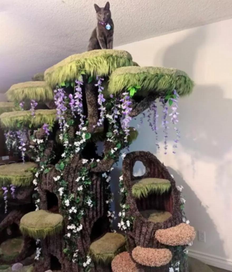 “Το σάπιο κούτσουρο δέντρου στα δεξιά φτιάχτηκε για τη γάτα μου την Piper, η οποία χρειαζόταν τον δικό της ιδιωτικό χώρο”, δήλωσε η Santiago. “Οι μεγαλύτερες πλατφόρμες φιλοξενούν τις μεγαλύτερες γάτες μας, όπως ο Λεωνίδας και η Noelle. Η γατούλα μας Khaleesi λατρεύει όλα τα κλαδιά και υπάρχει ένα κρεβάτι ακριβώς στη μέση μόνο γι’ αυτήν. Η Wolfie είναι μεγάλη θαυμάστρια του να βρίσκεται στην κορυφή, όπως και ο Leo, οπότε φροντίσαμε να υπάρχουν αρκετές ψηλές πλατφόρμες ώστε να μην υπάρχει μάχη για την κορυφή. Καθώς συζητούσαμε για το τι ψάχνουμε, με την πάροδο του χρόνου αυτό μεταμορφωνόταν συνεχώς!”