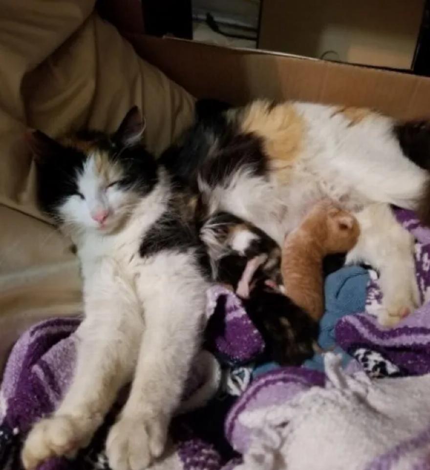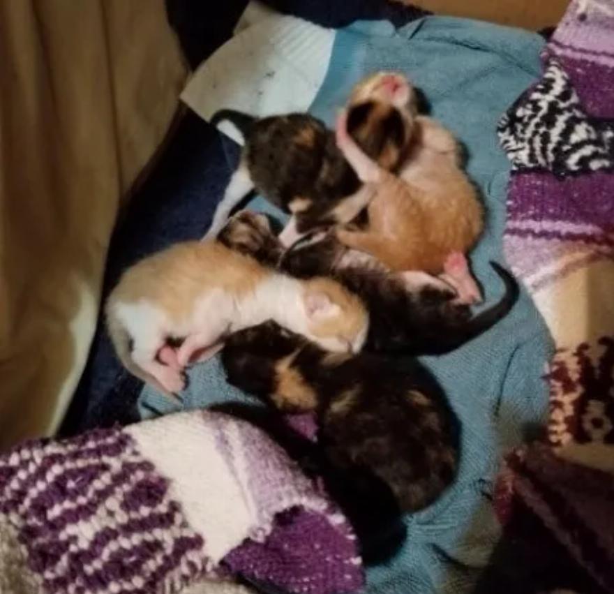 Λίγη ώρα αργότερα, η Callie σηκώθηκε και βγήκε από την πόρτα. Ένα-ένα, έφερε τα υπόλοιπα γατάκια από τη γέννα της στο διαμέρισμα – πέντε μικρά γατάκια κατάφεραν να μπουν με ασφάλεια στη νέα τους κατοικία.