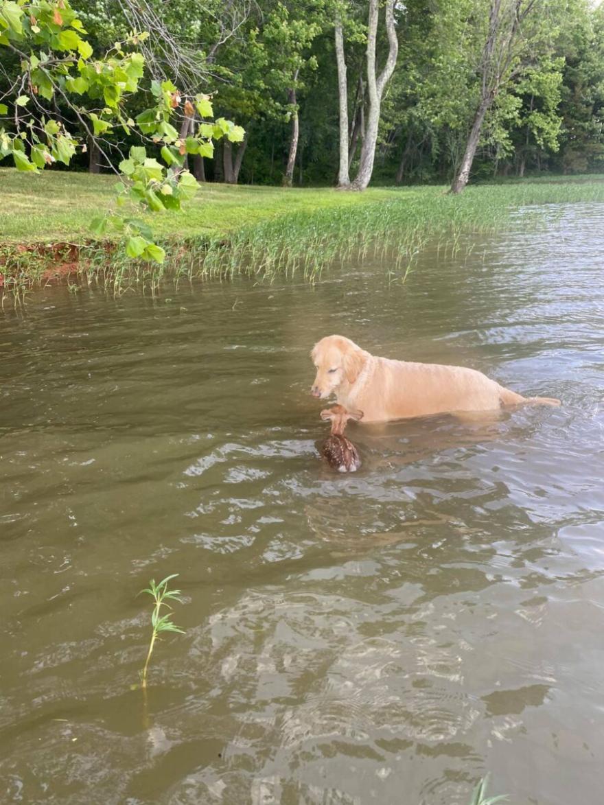 Λοιπόν, ο Harley βρέθηκε στη μέση μιας λίμνης -αλλά για έναν πολύ καλό λόγο. “Έτρεχε” το ελαφάκι πίσω στην ακτή. Ο Dorn τους περίμενε στην ακτή και σήκωσε το ελάφι από το νερό. Τότε ήταν που ο Harley άρχισε να γλείφει το ελάφι. Ώρα για καθάρισμα!
