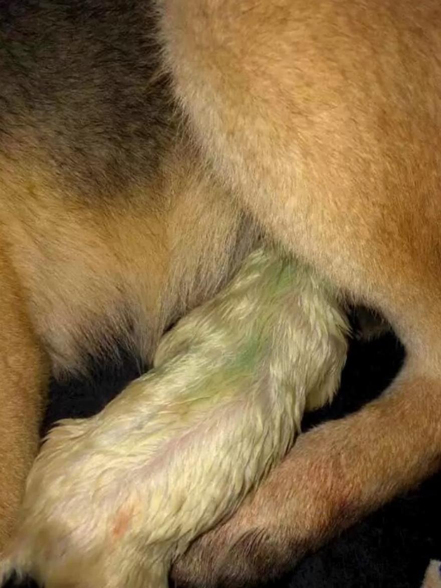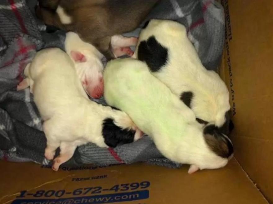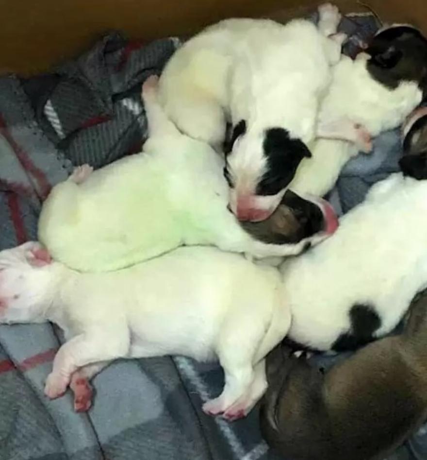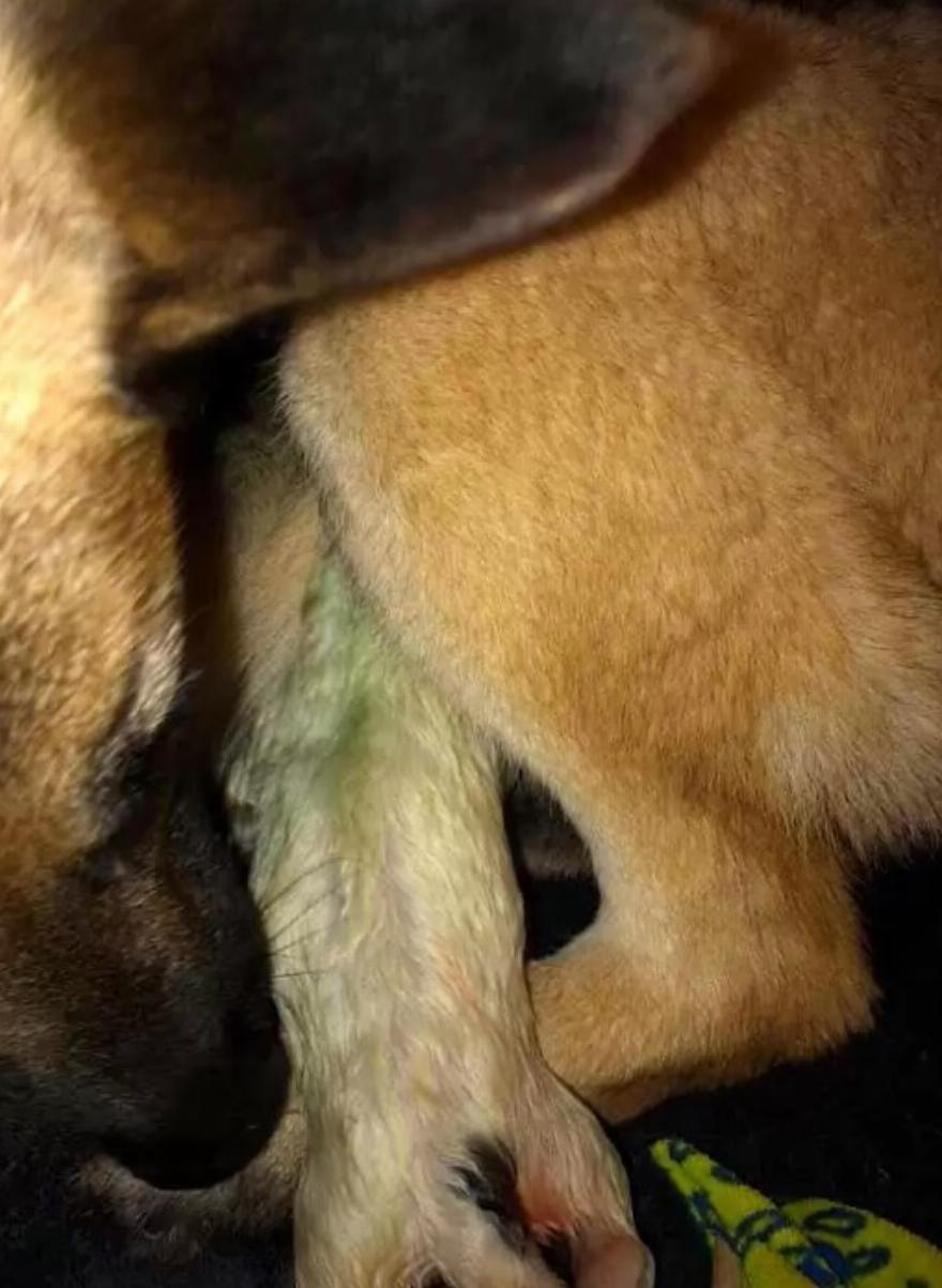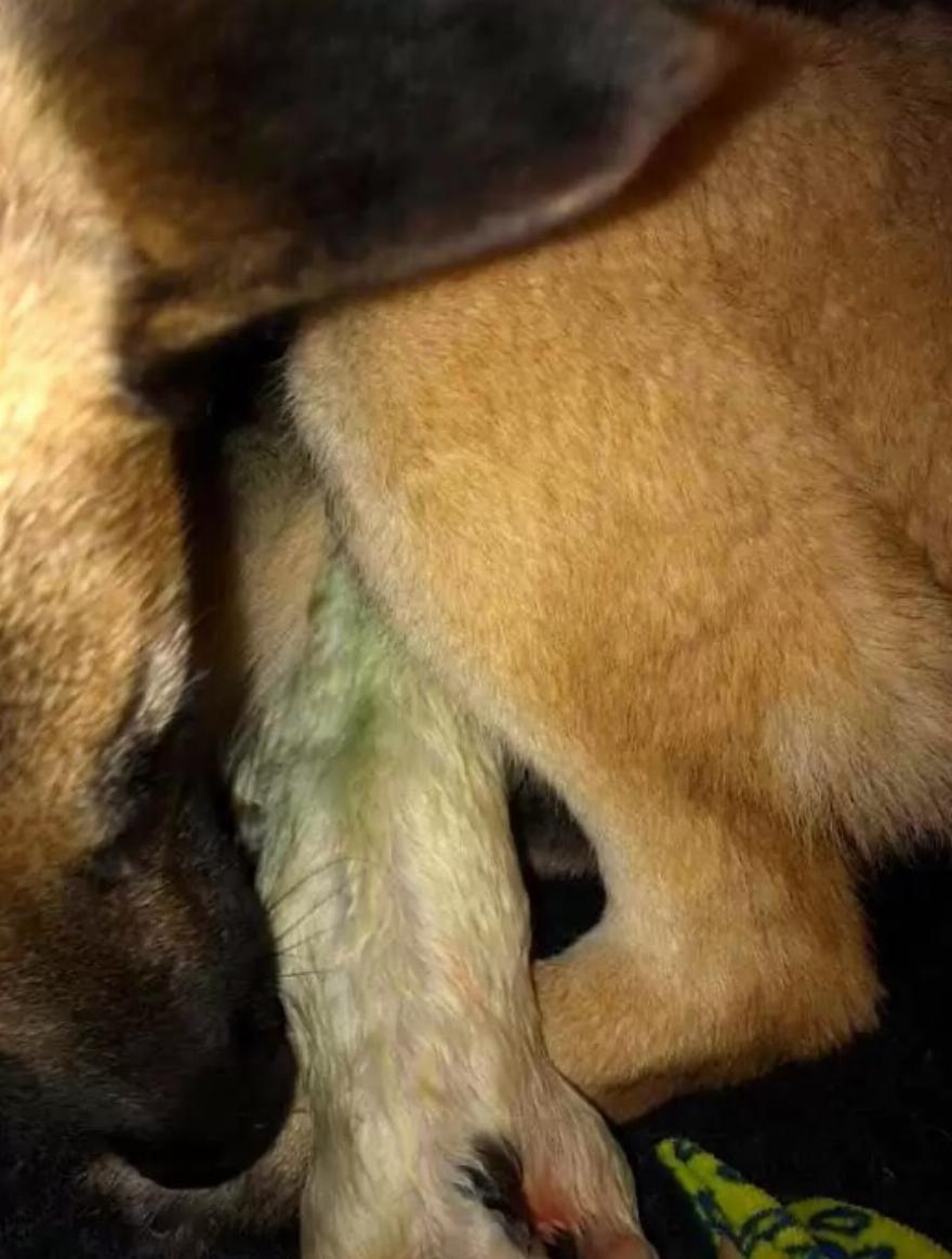Ένα πολύ σπάνιο κουτάβι με πράσινο τρίχωμα αγκαλιάστηκε δίπλα στα άλλα στην κοιλιά της Ρίμπα για να θηλάσει.