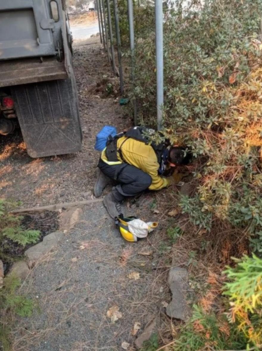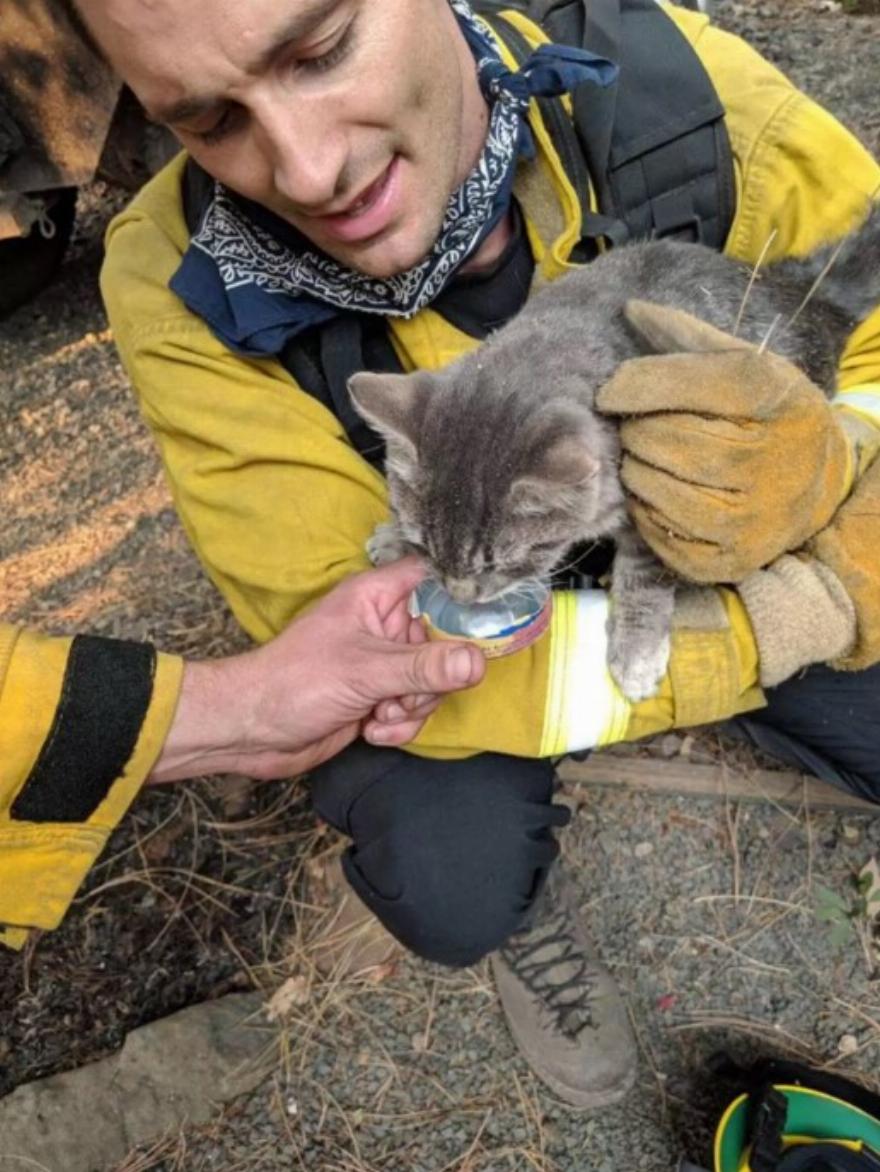 Eνώ περιπολούσαν σε περιοχές που επλήγησαν από την πυρκαγιά Camp Fire και εκκενώθηκαν λόγω της τεράστιας πυρκαγιάς, ένα συνεργείο της Πυροσβεστικής Υπηρεσίας Foster City άκουσε έναν ήχο που δεν μπορούσαν να αγνοήσουν – τις απελπισμένες κραυγές ενός πλάσματος που είχε ταμπουρωθεί κάτω από έναν θάμνο.