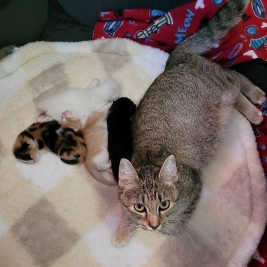 Το τιγρέ γατάκι μάλλον έμεινε εκεί έξω ενώ ήταν ακόμη σε λοχεία: γέννησε τουλάχιστον ένα από τα τρία μωρά της εκεί και χρειαζόταν άμεση βοήθεια, έτσι η Kayla τα κράτησε ασφαλή για λίγες μέρες στο διαμέρισμά της, όσο ένας εθελοντής από το καταφύγιο θα μπορούσε να οργανωθεί για να φιλοξενήσει όλη την οικογένεια.