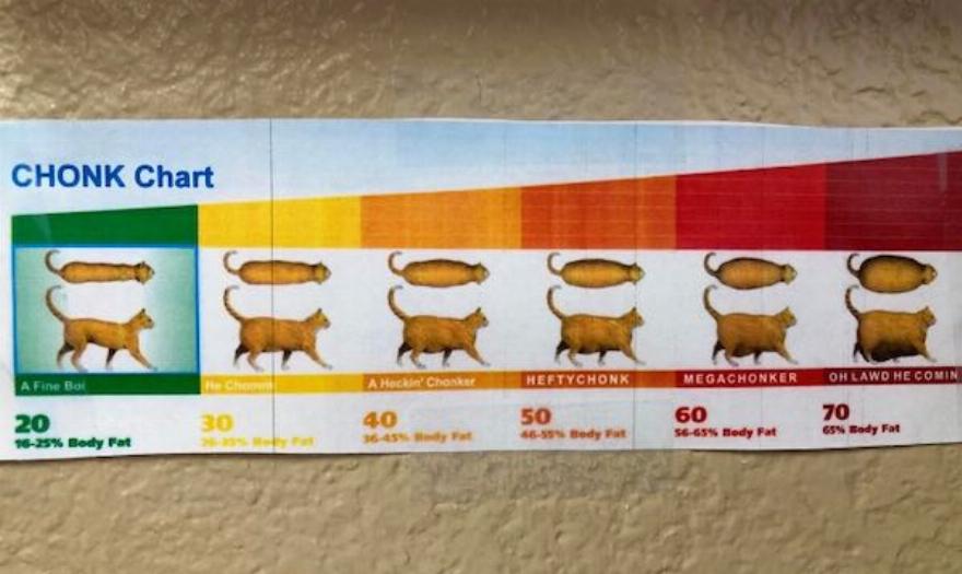Ένα δημοφιλές “chonk chart”, ένας πίνακας βάρους για γάτες, τοποθετεί τον Πάτσες στη σκοτεινή κόκκινη ζώνη του “Oh lord he comin”, την κατηγορία πέρα από το “megachonker” που δείχνει ότι ο Πάτσες έχει περίπου 65% σωματικό λίπος.