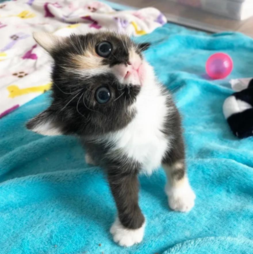 Το μικροσκοπικό calico γατάκι άνοιξε τα μάτια της σε ηλικία περίπου δύο εβδομάδων