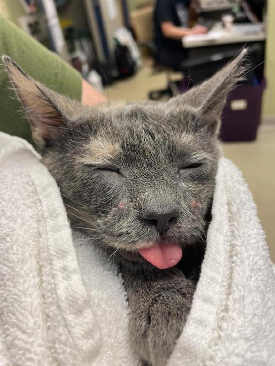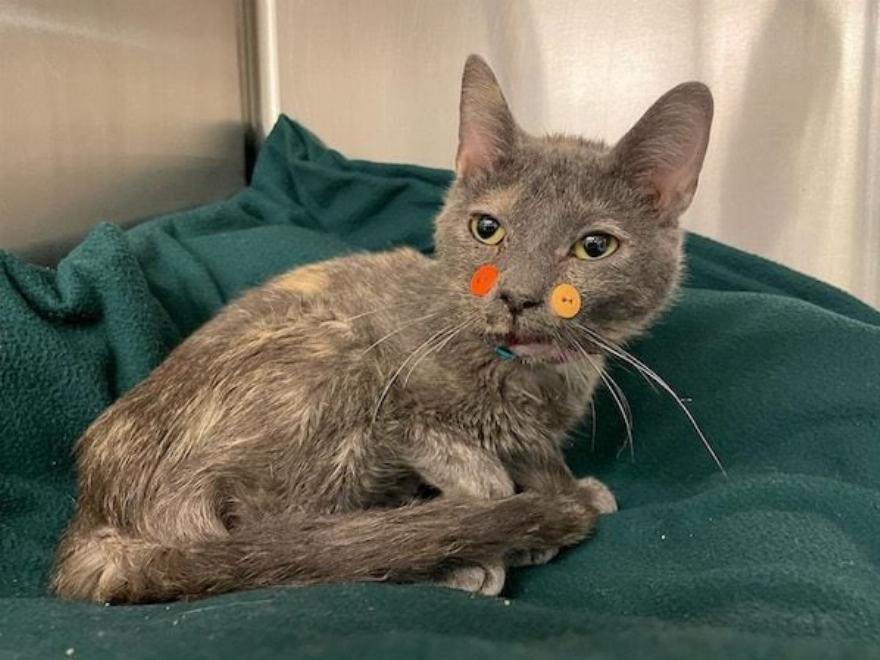 Τον Μάιο, το γατάκι μεταφέρθηκε εσπευσμένα στη διάσωση αδέσποτων του Σεντ Λούις για περίθαλψη. Εκεί, οι κτηνίατροι του καταφυγίου διαπίστωσαν ότι ήταν σε άσχημη κατάσταση και θα χρειαζόταν επείγουσα χειρουργική επέμβαση.