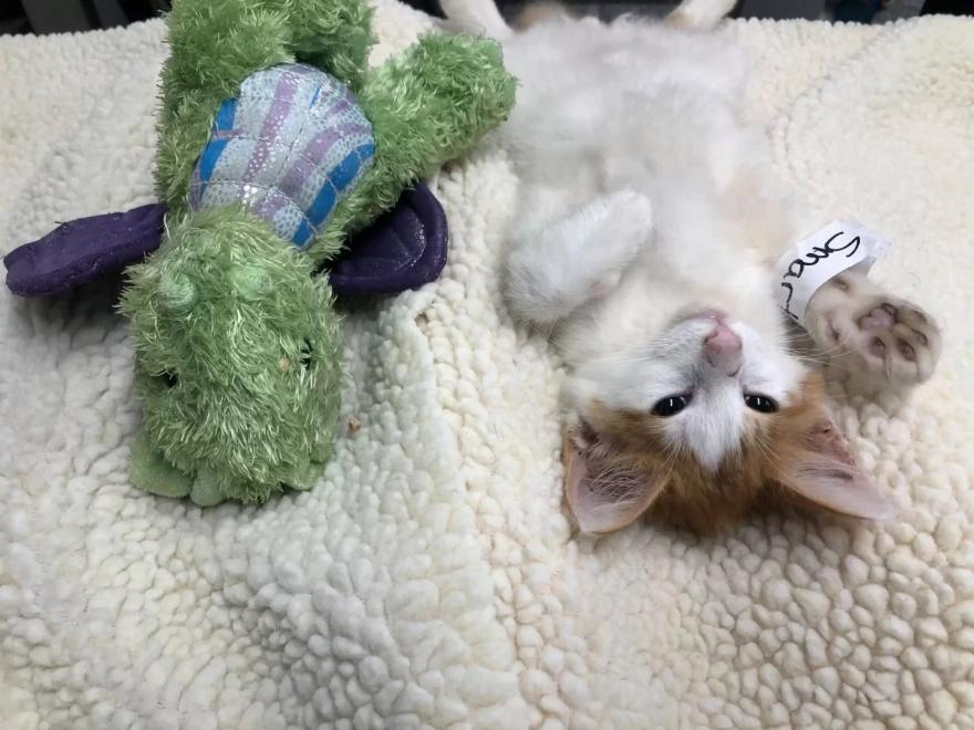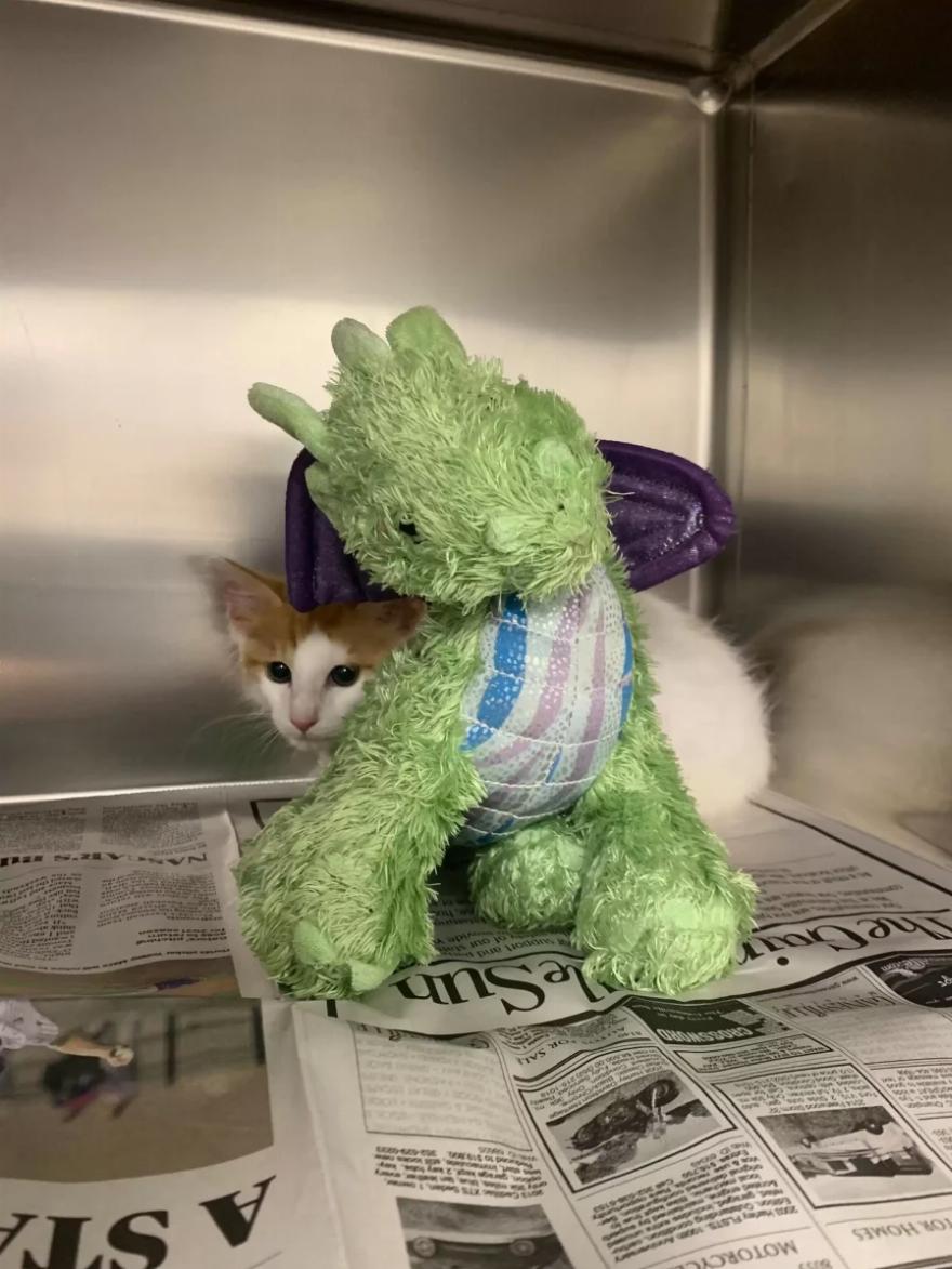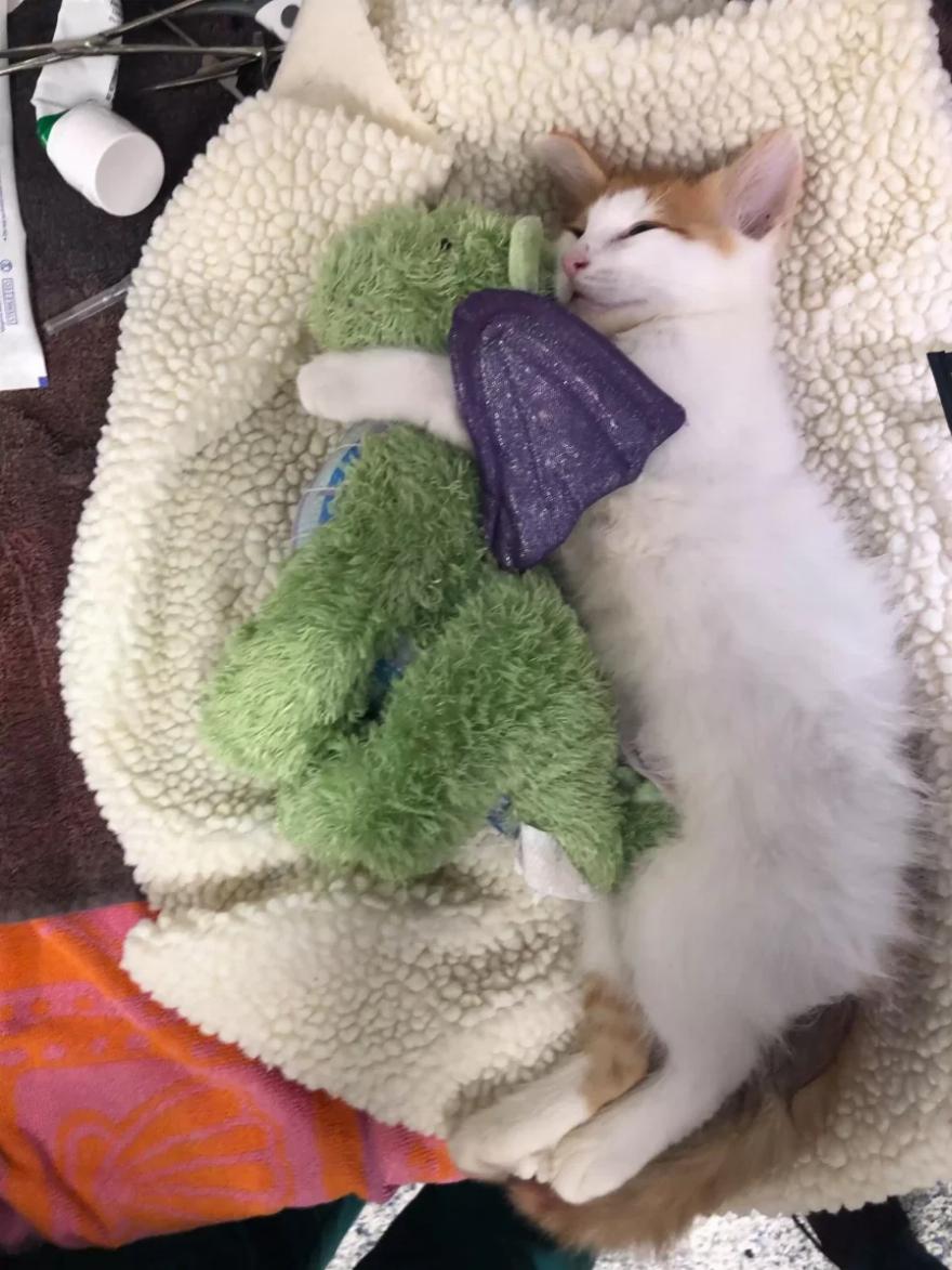 “Όταν ο Ponyo έφτασε στην κλινική, ήταν πολύ νευρικός”, δήλωσε στο The Dodo η Melissa Jenkins από το Operation Catnip. “Όλοι παρατηρήσαμε τον γλυκό του φίλο δράκο στο μεταφορέα μαζί του, οπότε βάλαμε τον δράκο στο κυνοκομείο μαζί του. Ο Ponyo στην αρχή κρύφτηκε πίσω από τον δράκο και σαφώς τον ανακούφισε”.