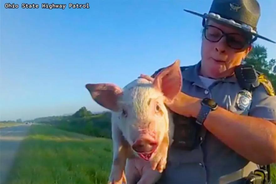 Οι αστυνομικοί της περιπολίας της Πολιτείας του Οχάιο παρέλαβαν το γουρούνι στην άκρη του δρόμου: είχε τραύματα από την πτώση, αλλά κατά τα άλλα ήταν σώο και αβλαβές.