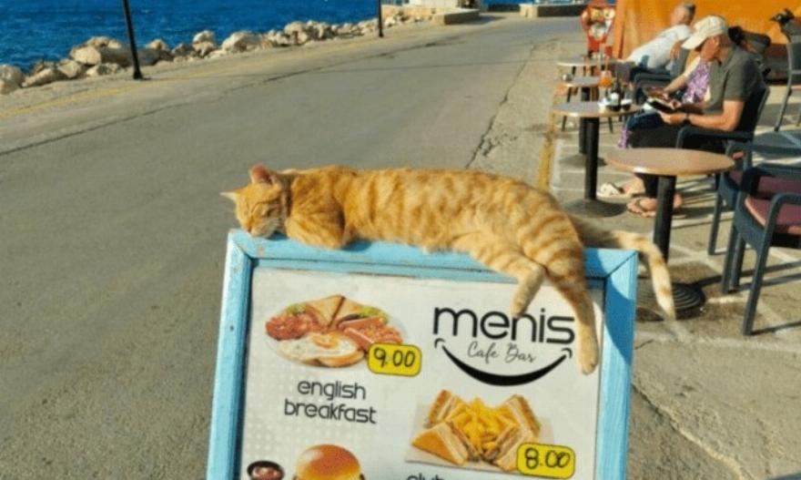 Ο πανέμορφος γάτος συνδυάζει την εργασία ως ιδανικός «κράχτης» του μαγαζιού, απολαμβάνοντας παράλληλα την ανάπαυσή του με θέα το γαλάζιο της θάλασσας.