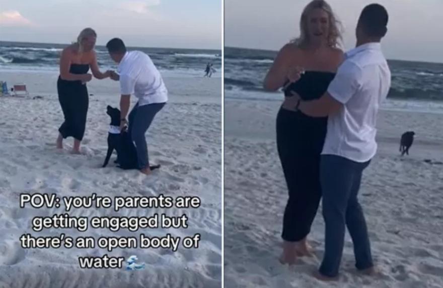 Το ξεκαρδιστικό βίντεο μοιράστηκε στο TikTok (@nolatheblacklab), με τη λεζάντα να αστειεύεται: «POV: οι γονείς σου αρραβωνιάζονται, αλλά υπάρχει νερό».
