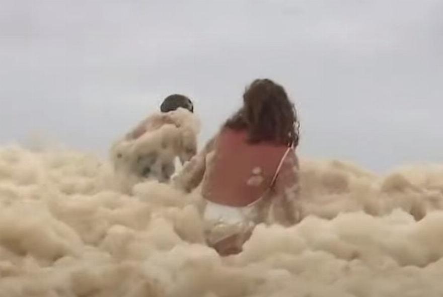 Μια οικογενειακή μέρα στην παραλία κατέληξε ύπουλη για έναν σκύλο ονόματι Χέιζελ, αφού εξαφανίστηκε κάτω από ένα βουνό από αφρό της θάλασσας που αναδύθηκε σε μια παραλία της Γκολντ Κόουστ στην Αυστραλία.