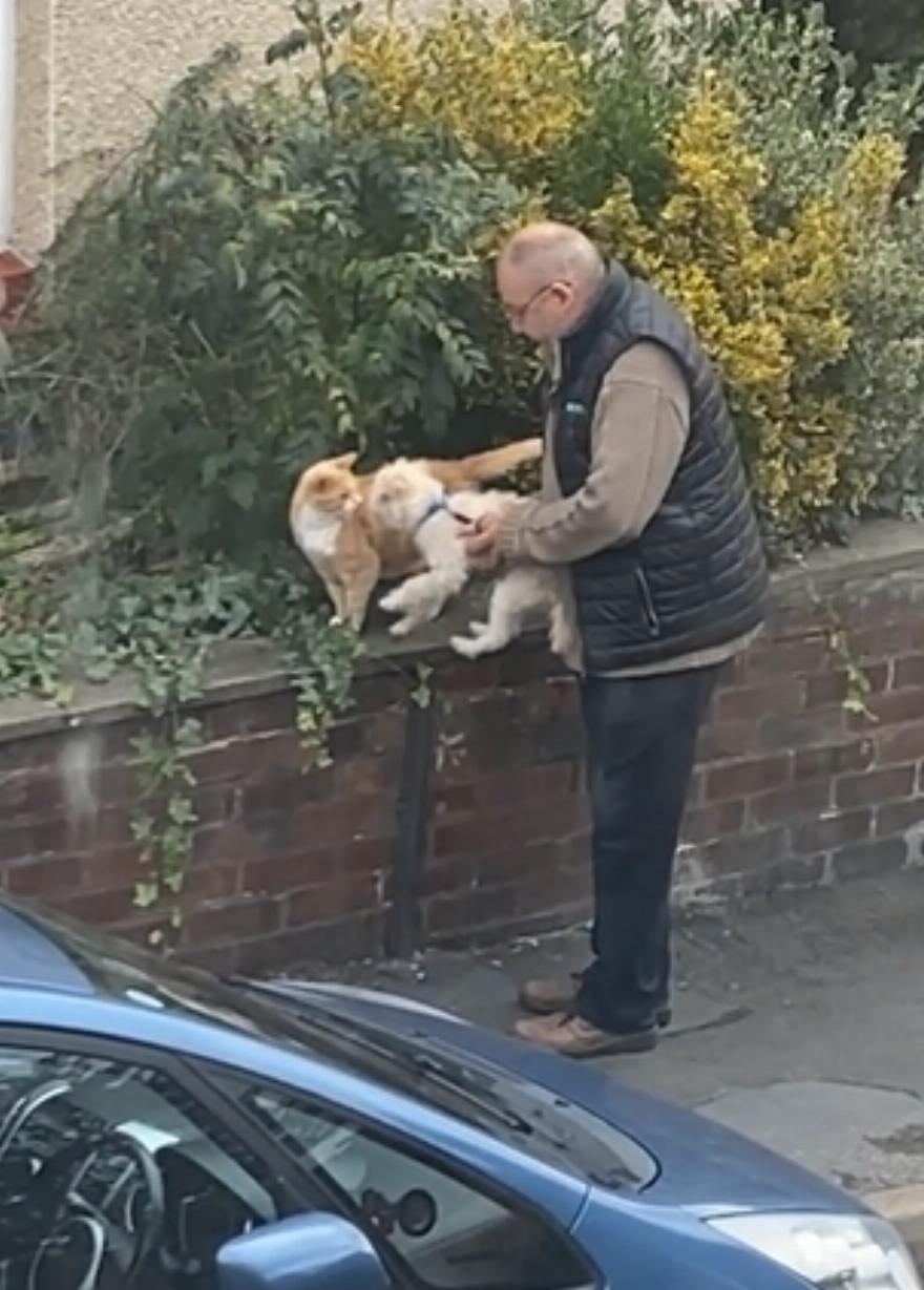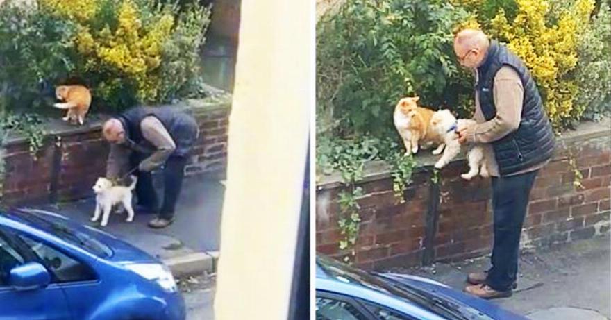 Η Cheyenne, μια γυναίκα, κοίταξε έξω από το παράθυρό της κανονικά, αλλά αυτή τη φορά είδε μια πολύ σπουδαία στιγμή! Ένας άνδρας προσπαθούσε να συστήσει το σκύλο του σε μια τυχαία γάτα, η οποία στεκόταν σε έναν τοίχο!