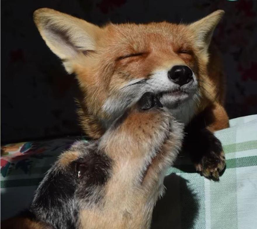 Η αλεπού έχει νιώσει τόσο άνετα, γύρω της που την αφήνει να τρίβει την κοιλιά της σαν να είναι κάτι το συνηθισμένο.