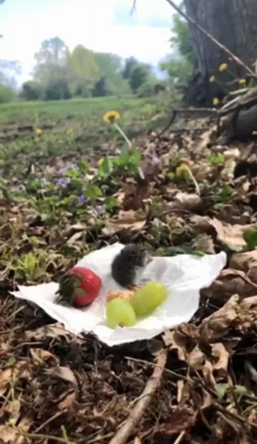Η Brighid άπλωσε μια πετσέτα για να τη χρησιμοποιήσει ως κουβέρτα πικνίκ και έβαλε λίγο φαγητό. Το ποντικάκι το λάτρεψε.