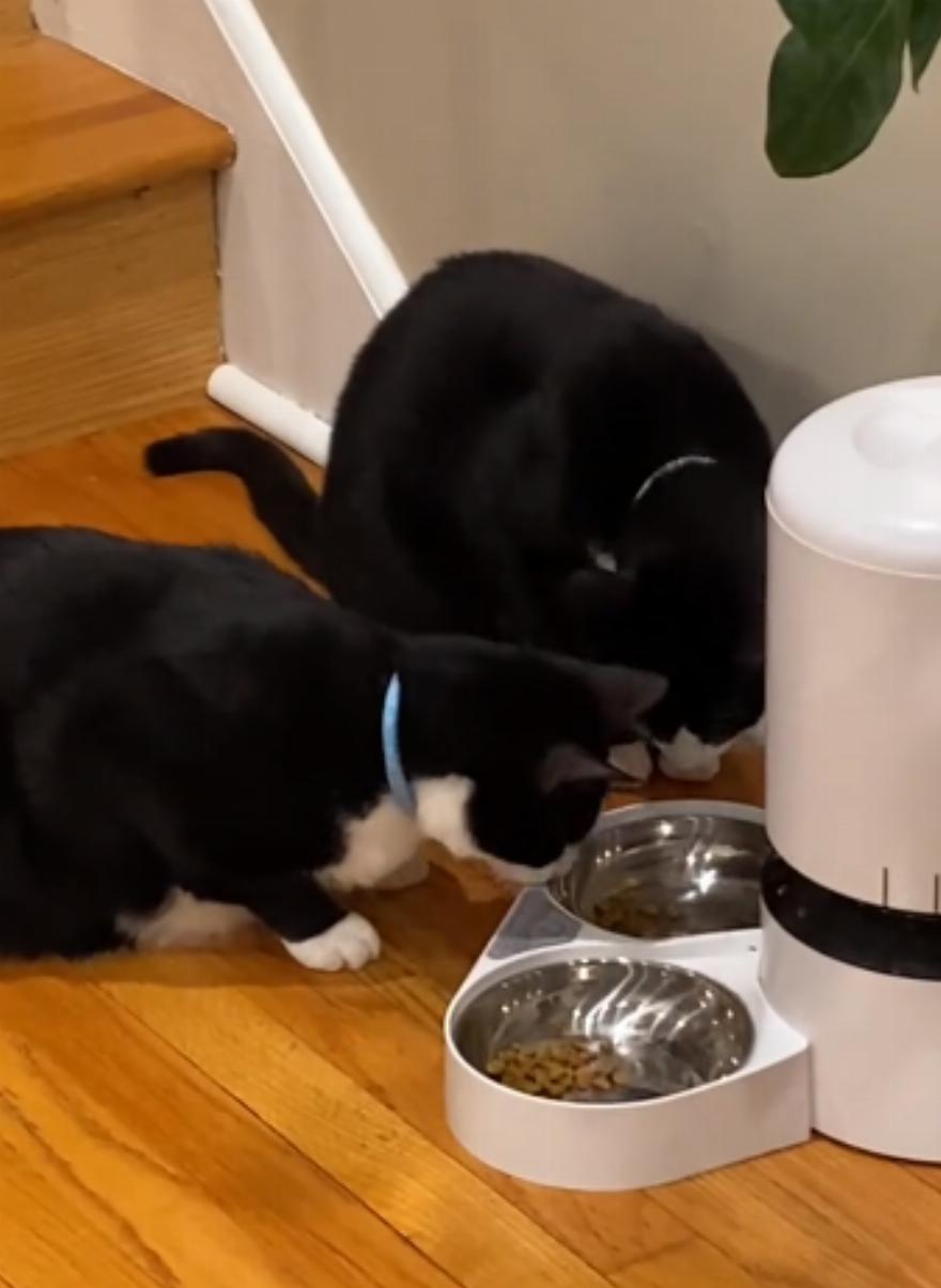 Το αιλουροειδές συνεχίζει να πατάει στο πλάι του διανομέα πριν ακουστεί ένα ακόμη μπιπ, καθώς το μηχάνημα λέει: “Είναι ώρα για γεύμα, είναι ώρα για γεύμα”. Στη συνέχεια, η τροφή διανέμεται σε ένα από τα μπολ στο κάτω μέρος της συσκευής και η άλλη γάτα εμφανίζεται να τρώει το φαγητό.