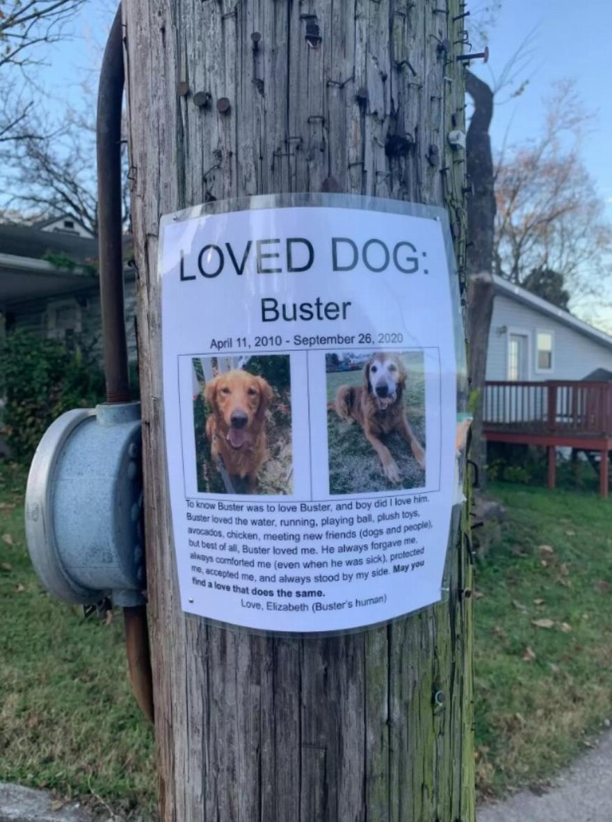 Αφού πέθανε ο Buster, η King άρχισε να σκέφτεται έναν τρόπο για να ανακοινώσει τα νέα στους γείτονές της που είχαν αγαπήσει και αυτοί τον Buster. Η κατασκευή μιας αναμνηστικής αφίσας φάνηκε να είναι ο καλύτερος τρόπος για να τιμήσει τη ζωή του Μπάστερ. “Αρκετά σύντομα αφότου απέκτησα τον Μπάστερ, θυμάμαι ότι είδα στα μέσα κοινωνικής δικτύωσης ότι κάποιος τύπος είχε φτιάξει μια αφίσα για τον σκύλο του και έγραφε “Loved””, είπε η Κινγκ. “Θυμάμαι να σκέφτομαι, ‘Αυτό είναι τόσο χαριτωμένο. Τι ωραίος τρόπος να γιορτάζεις το σκύλο σου”. Και αυτό μου έμεινε”.