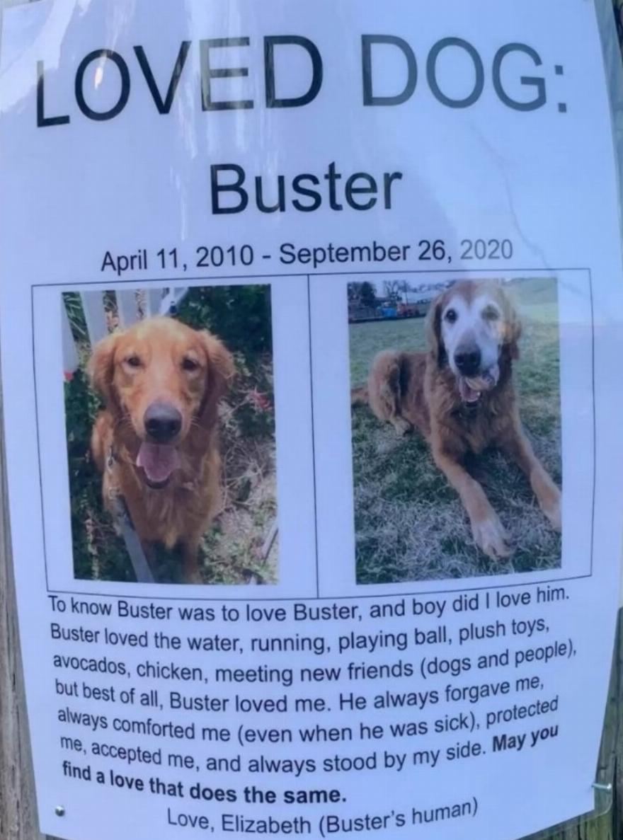 Η Clemens αναγνώρισε τον σκύλο στην αφίσα ως τον Buster, το χαρούμενο golden retriever που είχε δει στις πολλές βόλτες της με τον Stanley. “Ο Μπάστερ ήταν ένα τόσο γλυκό ηλικιωμένο κουτάβι – ένα κουτάβι που σίγουρα κάνεις προσπάθεια να σταματήσεις και να του πεις ένα γεια!” δήλωσε η Clemens. “Τον ενδιέφερε εξίσου να λέει γεια στους ανθρώπους όσο και στα άλλα σκυλιά”.