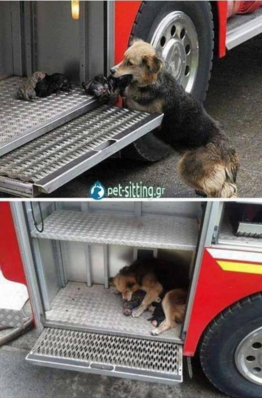 Ενώ στις εφημερίδες διαβάζουμε συχνά για γυναίκες που εγκαταλείπουν τα παιδιά τους σε κάδους, τα σκοτώνουν ή τα κακοποιούν, μια μητέρα σκυλίτσα μας έδειξε τι σημαίνει αληθινή μητρική αγάπη και θυσία. Κατά τη διάρκεια μιας πυρκαγιάς, αυτή η ηρωική σκυλίτσα έσωσε όλα τα κουτάβια της, μεταφέροντάς τα ένα προς ένα στο πυροσβεστικό όχημα, γνωρίζοντας ότι εκεί θα ήταν ασφαλή.