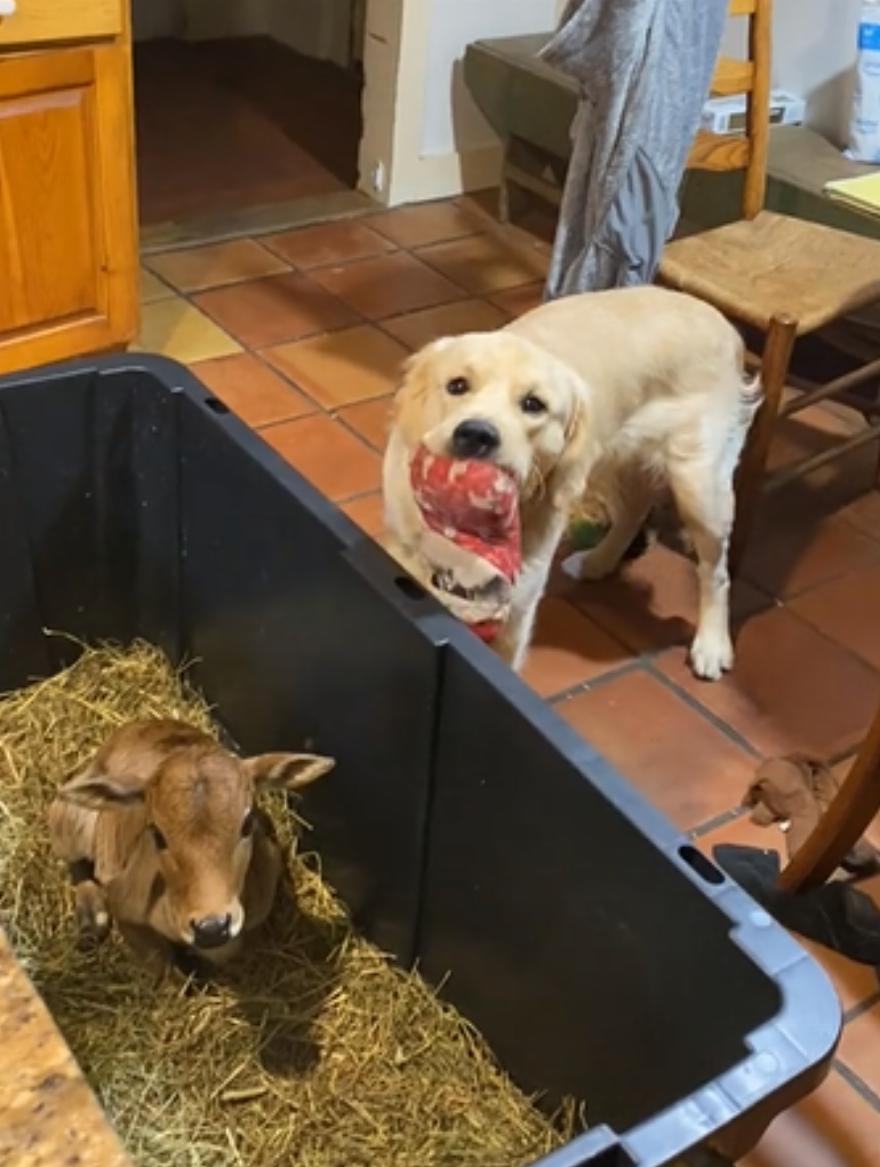 @kysarahgsdRiley our Gilden retriever sharing his toy with our bottle baby zebu calf