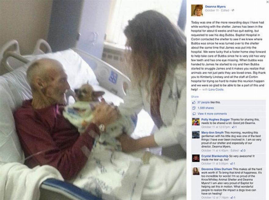 “Όταν ο Bubba δόθηκε στον Τζέιμς άρχισε να κλαίει και μετά ο Bubba άρχισε να αγκαλιάζει τον Τζέιμς και αυτό σε κάνει να συνειδητοποιείς ότι τα ζώα δεν είναι απλά κατοικίδια, είναι αγαπημένα πρόσωπα”, έγραψε στη σελίδα της στο Facebook η Ντεάνα Μάιερς, διευθύντρια του καταφυγίου ζώων Knox Whitley.