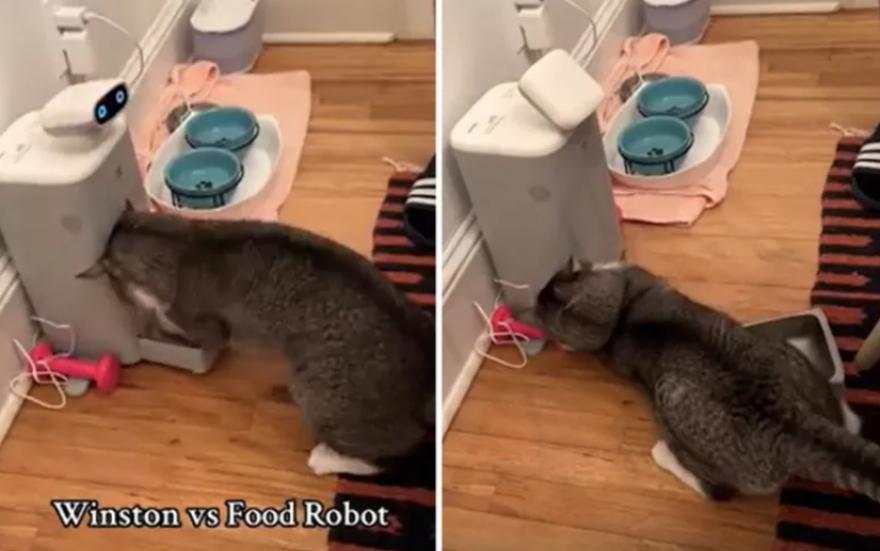 Η στιγμή που μια ανυπόμονη γάτα αποφάσισε να κηρύξει τον πόλεμο σε ένα ρομπότ-ταϊστρα έχει γίνει viral στο TikTok.
