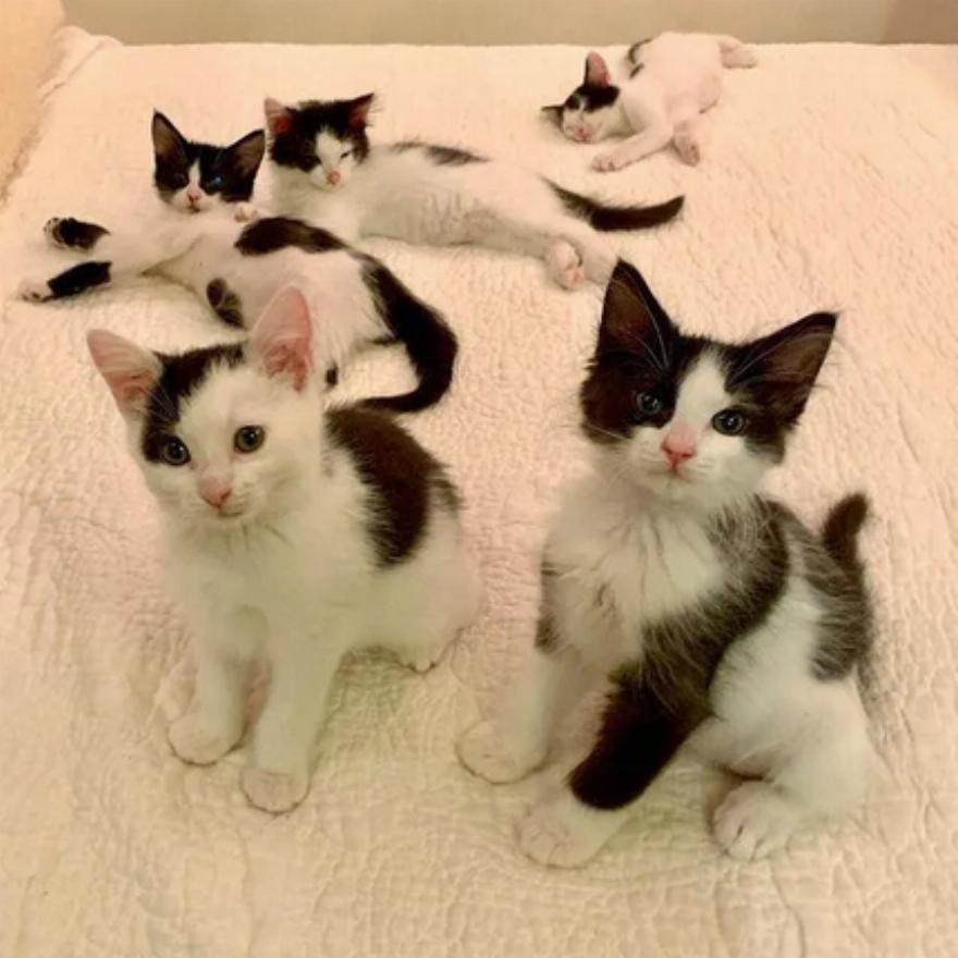 Τα πέντε ορφανά μικρά μεγάλωναν σε πανέμορφες νεαρές γάτες με τόσα πολλά να δώσουν. Λατρεύουν τη ζωή τους ως κακομαθημένα οικόσιτα γατάκια και απολαμβάνουν την ευτυχία τους με τους ιδιοκτήτες και τα γατίσια αδέρφια τους για πάντα.