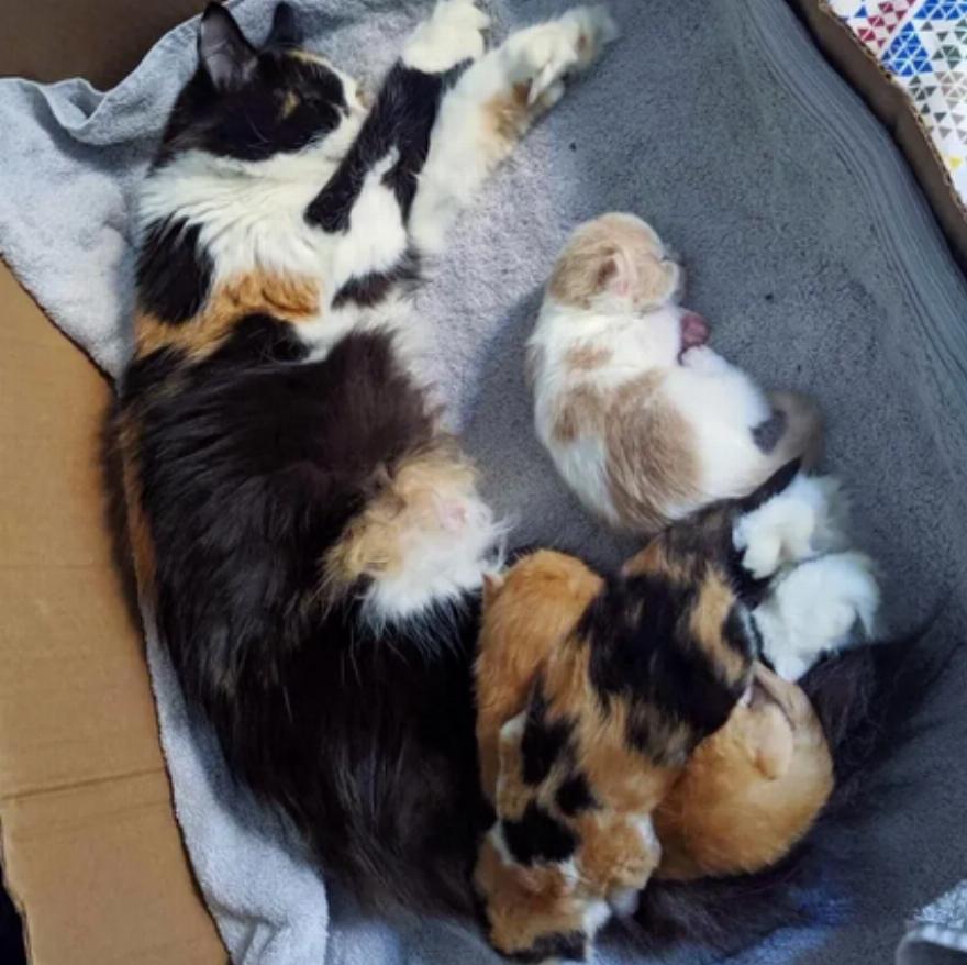 Λίγες ώρες αργότερα, το τρίτο και τελευταίο γατάκι ήρθε στον κόσμο. Μια μικροσκοπική γάτα calico με σημάδια ακριβώς όπως η μαμά. Και τα τρία γατάκια θήλασαν μέχρι το πρωί.